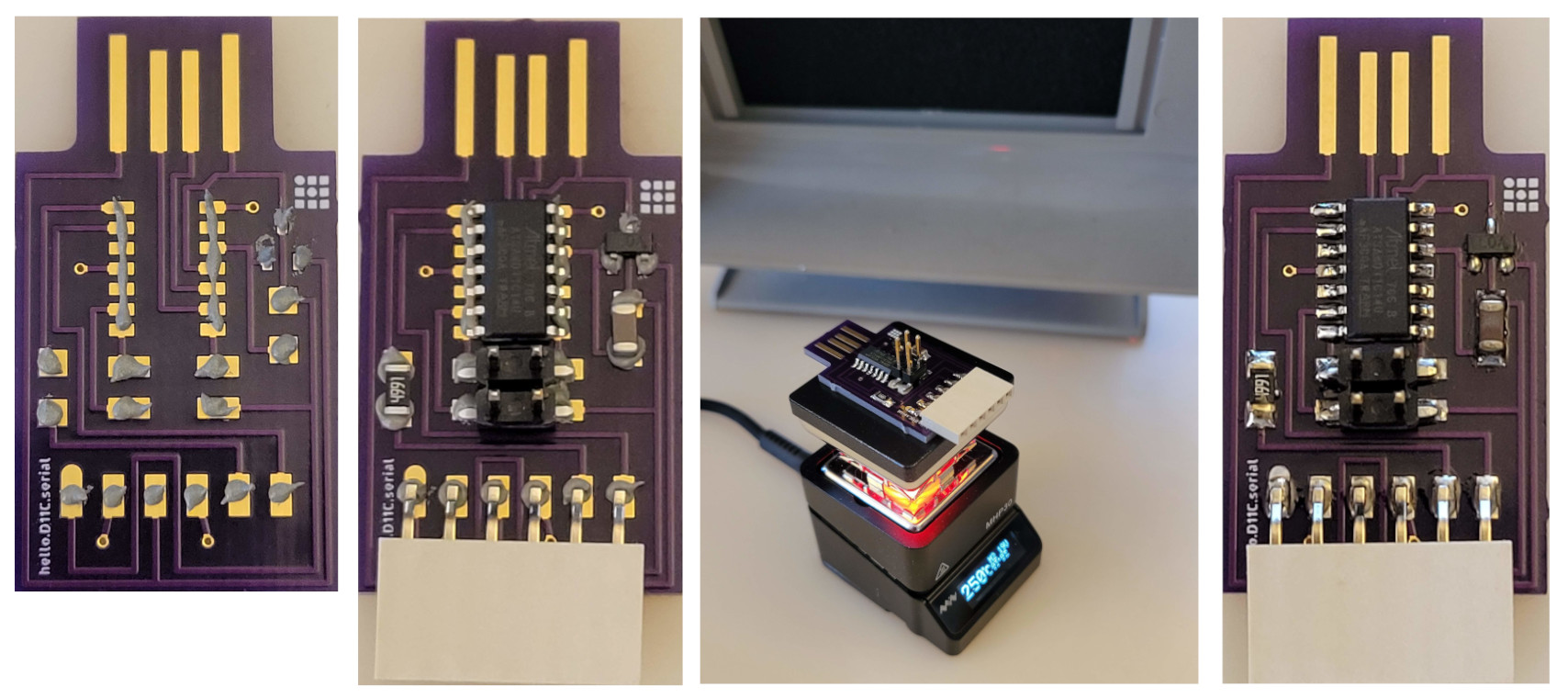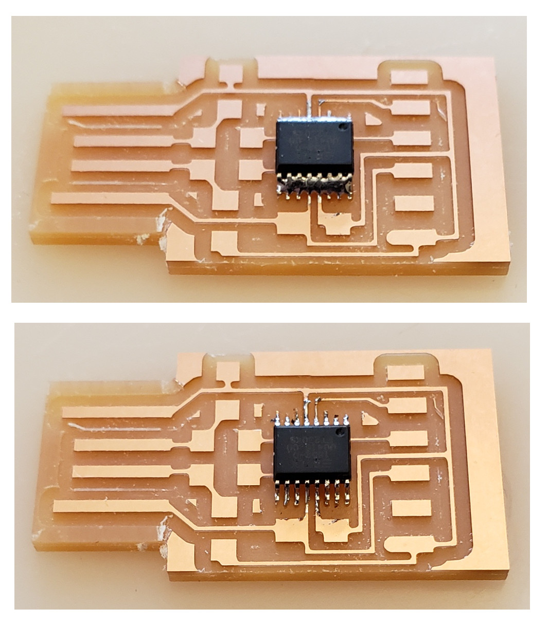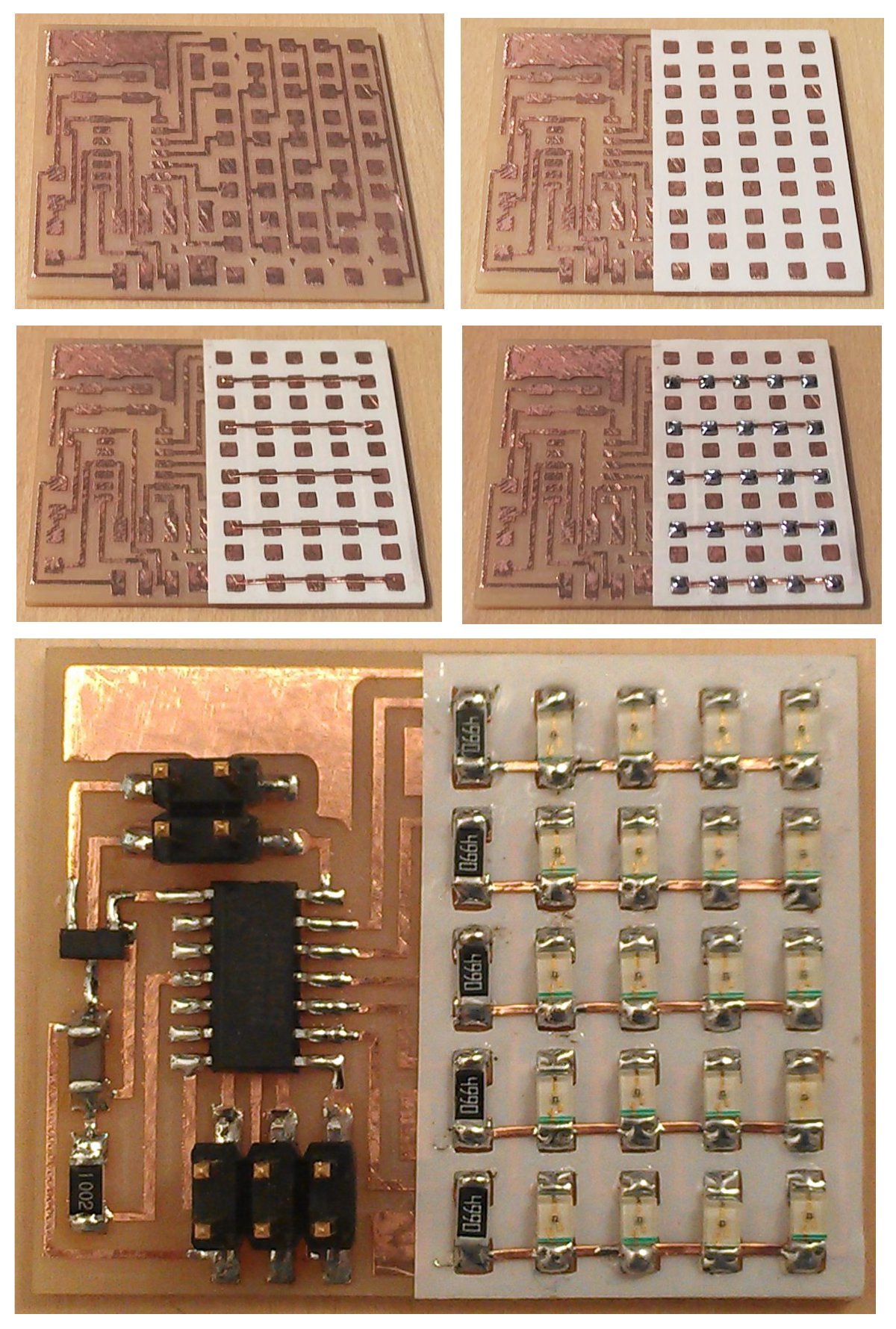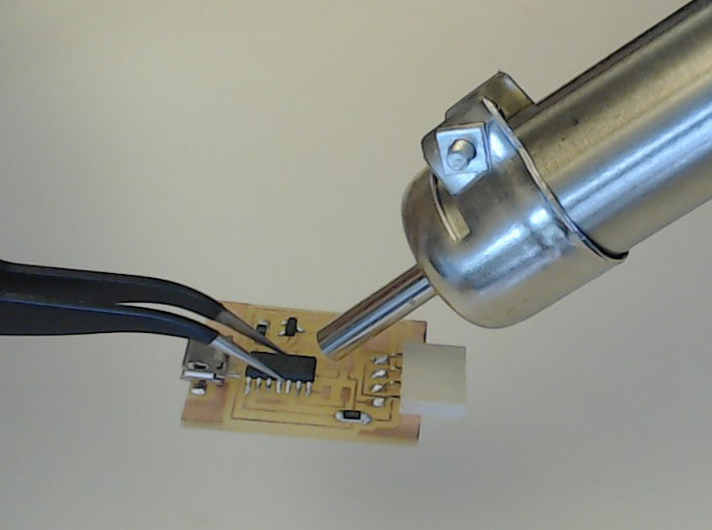 PCB (Printed Circuit Board) fabrication dead bug circuits etching set-up, feature size, batch lithography, transfer, print ferric/cupric chloride, ammonium/sodium persulfate citric acid, peroxide SDS water consumption waste machining finish machines tools 0.010 1/64 1/32 V-bits tapered bits fixturing underlay zeroing mounting lowering probing set-screws, collets lifetime deburring cleaning climb vs conventional nesting registration vinyl cutter flex connections encapsulation milling laser cutter engraver combined LIG printing conducting inks plating sewing PCB materials rigid FR4 (epoxy glass) FR1 (phenolic paper) garolite flex Kapton, Pyralux #1 epoxy film, #1126 copper tape high-frequency teflon glass copper 0.5 oz: 17.5 um 1.0 oz: 35 um 2.0 oz: 70 um board houses JLCPCB, PCBWay, OSH Park, Aisler, PCB, assembly design rules width/spacing (15, 5 mils) layers 1, 1.5, 2, 2+, 4, N mechanical, drill, solder mask, silk screen vias wires, header, rivets, plated, blind, buried components through-hole surface-mount chip-scale breadboards assembly solder iron station fume extractor microscope burns ROHS types lead-free wire paste SDS leaded wire paste SDS low-temp wire paste bismuth eutectic tinning wetting manual, drag, wave cold solder joints, solder bridges, checking joints flux core, paste, pen reflow stencil hot plate, convection oven, IR FR1 vs FR4 hot air wire, paste preheat QFN, MLF, CSP, BGA, ... heat-and-squish, tin-and-heat stuffing component orientation tacking down parts bottom to top, inside to outside headers washing desoldering braid tweezers vacuum hot air gravity cutting traces, adding jumpers placement pick-and-place encapsulation CAM formats Gerber/RS-274X png resolution FlatCAM pcb2gcode gerber2img gerber2png wiki mods tool changer video trace width traces traces+exterior interior 1/64" 0.010" V-bit fiber laser galvo laser pad, trace size debugging inspect, reflow solder joints check component orientation, values verify data sheets confirm connector orientation measure supply voltages probe I/O signals Quentin Isaak Sean group assignment: • characterize the design rules for your in-house PCB production process • submit a PCB design to a board house individual assignment: • make and test an embedded microcontroller system that you designed • extra credit: make it with another process