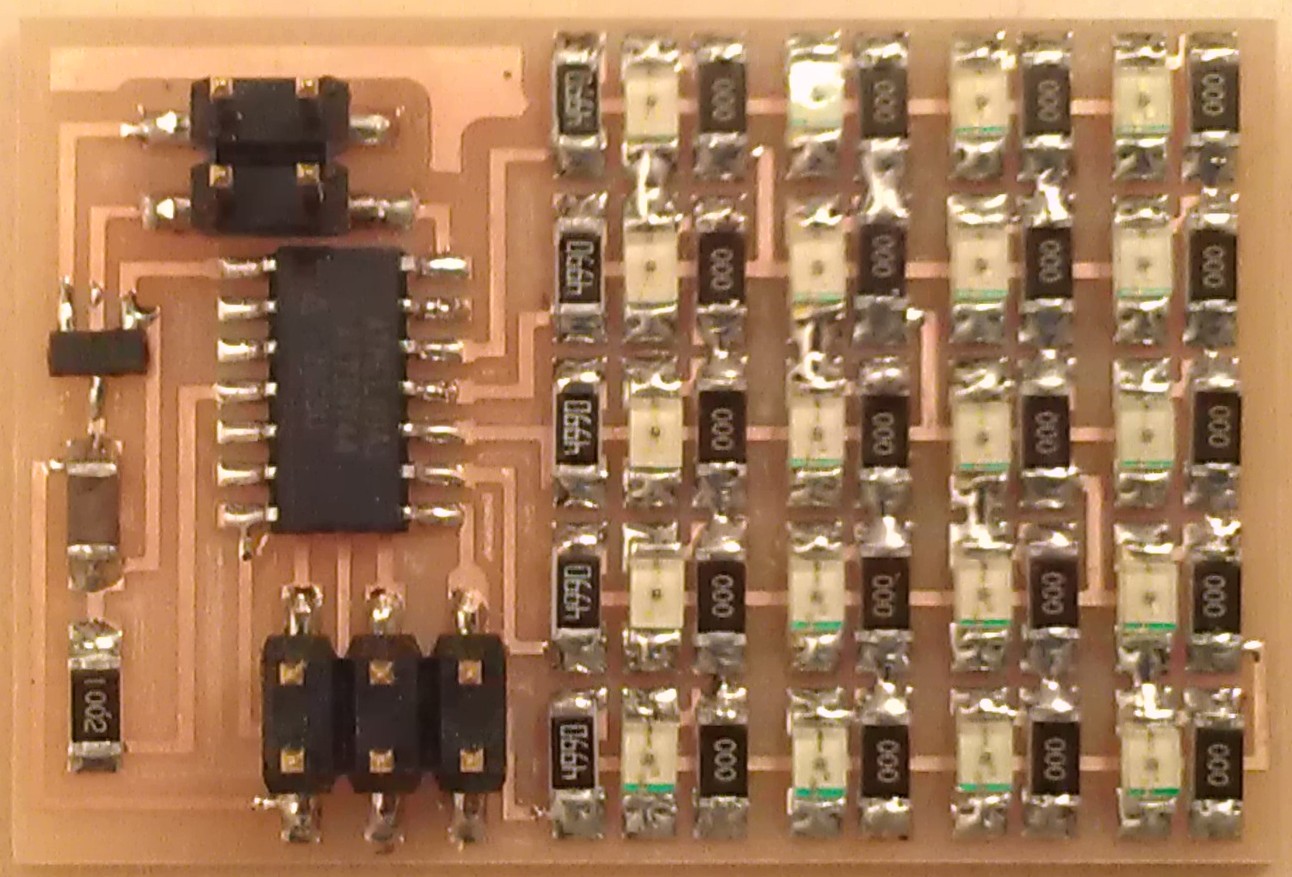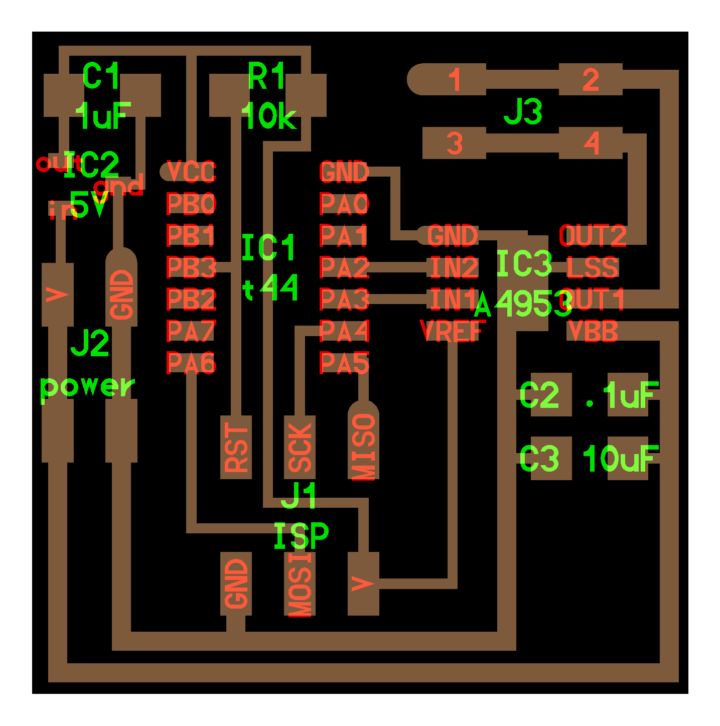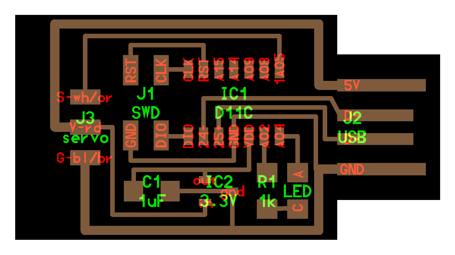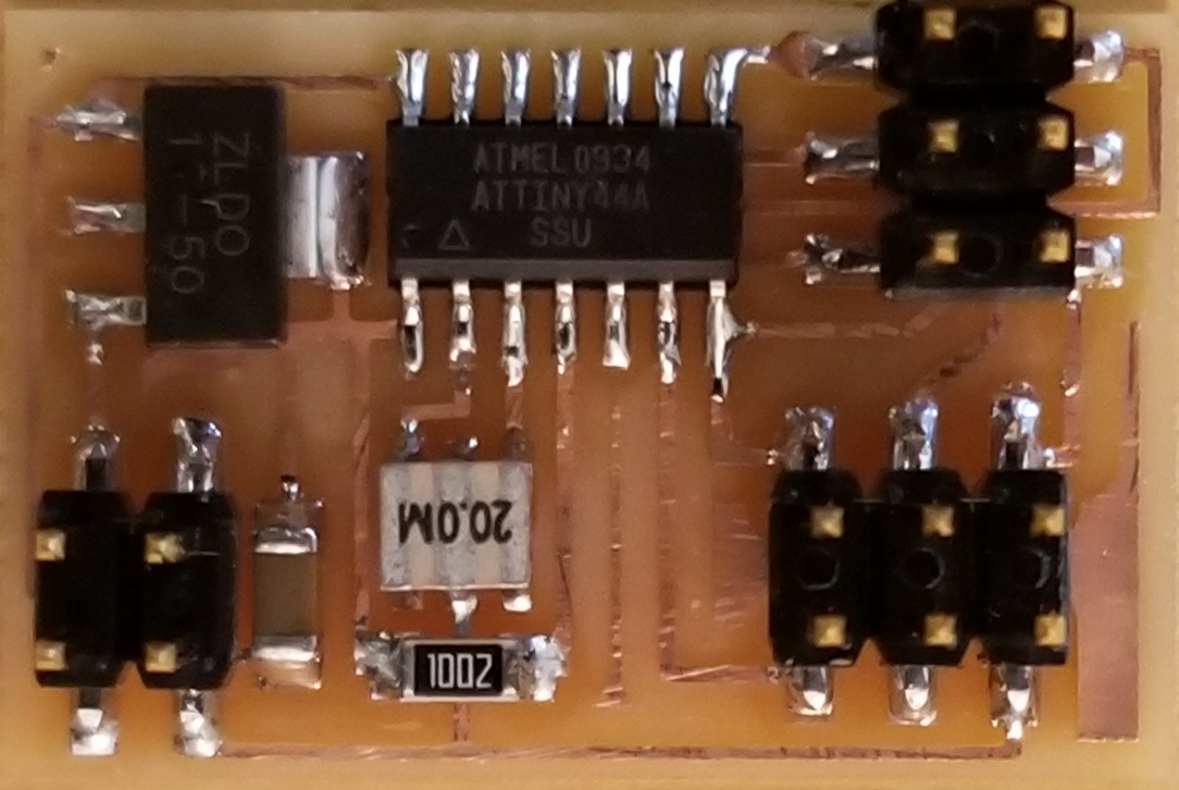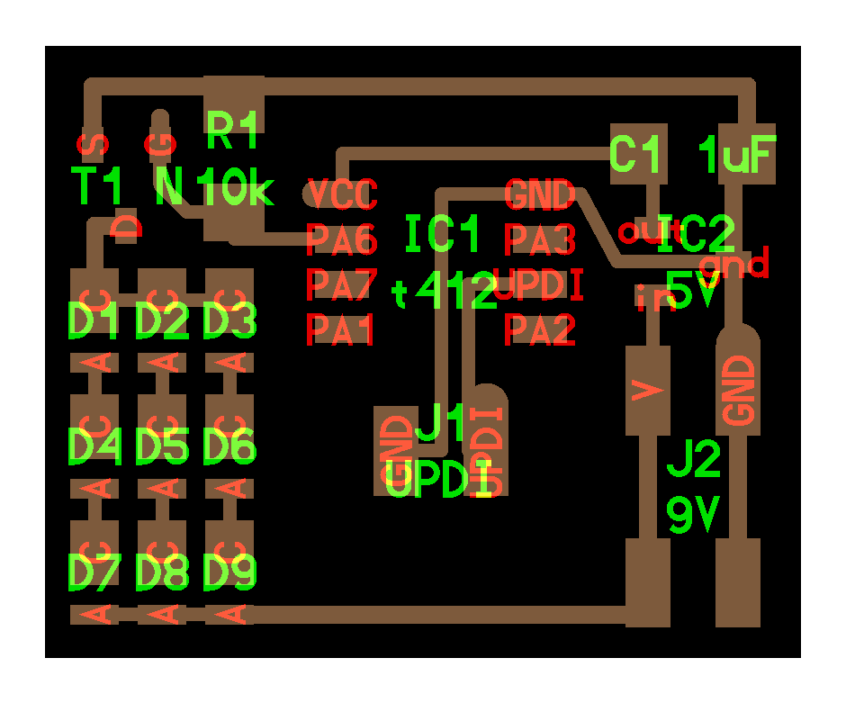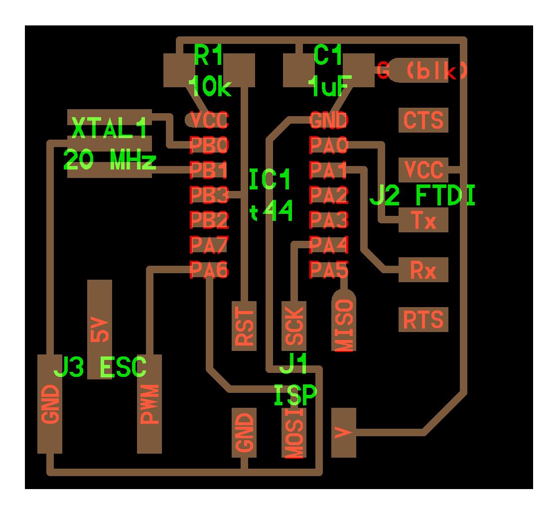 electrical safety ~1 mA: OK ~10 mA: shock, contraction ~100 mA: fibrillation body: M ohm external, k ohm internal dielectric breakdown: ~kV/mm supply capacitors inductive flyback polarity protection diode, MOSFET level shift MOSFET connector polarization, orientation circuit protection power wire gauge USB charger hub battery module meter power supply bench switching, linear, regulated supercapacitor LiPo battery charge controller storage wireless current measurement in-line meter supply regulation sense resistor magnetic field inductance LED current limiting hello.button-blink.C3 board components traces interior hello.button-blink.C3.ino hello.button-blink.C3.py video PWM hello.fade.C3.py video Charlieplexing hello.array.44 board components traces traces+exterior interior C makefile video hello.array.44.2 board components bottom vias top top+exterior interior C makefile video RGB LED pixels lights wires NeoPixel/WS2812B/SK6812 hello.WS2812B board components top interior hello.WS2812B.RP2040.py video Arduino Micropython library 3 in 1 hello.RGB.45 board components traces traces+exterior interior C makefile video LEDs diode drop, series-parallel MOSFET N, P, N floating gates, gate resistors dissipation, Rds, switching BJT, BiCMOS, IGBT hello.LEDs.t412 board components traces traces+exterior interior hello.LEDs.t412.ino video thermal runaway eye safety displays LCD HD44780 library hello.LCD.44 board components traces traces+exterior interior C makefile video I2C PCF8574 library hello.I2C.t1614 hello.LCD.I2C.ino video OLED SSD1306 hello.SSD1306.RP2040 board components top holes interior hello.SSD1306.RP2040.py ssd1306.py video library scripts hello.SSD1306.45 board components traces traces+exterior interior C makefile video TFT ILI9341 library hello.ILI9341.SW.D21E board components traces traces+exterior interior video hello.ILI9341.HW.D21E board components top top+exterior bottom holes interior video ST7735 video E Ink modules video RS170, NTSC, PAL, SECAM, VGA 75 ohm impedance hello.video.44 board components traces traces+exterior interior C makefile video SPI TVout thinner client color DC motor H-bridge TB67H451AFNG,EL TB67H453FNG(O,EL) hello.TB67H451.RP2040 board components top interior hello.TB67H451.RP2040.ino hello.TB67H451.RP2040.py boot.py video hello.H-bridge.D11C board components traces traces+exterior interior hello.H-bridge.D11C.ino video A4950 hello.H-bridge.44 board components traces traces+exterior interior C makefile video Dual H-bridge DRV8847 torque, power, efficiency, gearing vibration heat speaker MP3 module library hello.DFR0299.RP2040 pro sch pcb board components top holes interior hello.DFR0299.ino video I2S MAX98357A library module hello.MAX98357A.RP2040 board components top holes interior hello.MAX98357A.RP2040.ino video PWM class D, library hello.TB67H451.RP2040.audio.ino hello.TB67H451.RP2040.audio.py boot.py video hello.TB67H451.RP2040.wave.py sample.py hello.py convert_byterray.py video hello.TB67H451.RP2040.wave.ino sample.ino sample.main.ino convert.py video hello.speaker.D11C board components traces traces+exterior interior hello.speaker.D11C.ino hello.speaker-registers.D11C.ino video solenoid servo motor 50 Hz ~1-2 ms PWM (dis)continuous rotation ATtiny412 hello.servo.t412 board components traces traces+exterior interior hello.servo.t412.ino hello.servo-registers.t412.ino video ATSAMD11C hello.servo-D11C board components traces traces+exterior interior hello.servo-registers.D11C.ino video ATtiny44 hello.servo.44 board components traces traces+exterior interior ZLDO1117 hello.servo.44.1 board components traces traces+exterior interior LM2940 C (hardware PWM) makefile C (two-channel, software PWM) makefile video brushless DC motor (BLDC) efficiency, density, reliability, noise inrunner, outrunner, pancake, fan, gimbal Kv (RPM/V) phases/rotation (6 typical) drive waveform open-loop, closed-loop control back EMF (BEMF) sensing ~1 (fan), 10 (drone), 100 (skateboard), 1000 (car) A,$ triple half-bridge A4949 hello.A4949.RP2040 board components top interior hello.A4949.RP2040.py video electronic speed controller (ESC) hello.ESC.44 board components traces traces+exterior interior C makefile video firmware servo PWM power input, output initialization, calibration stepper motor types wire identification step size (1.8 degrees typical) full, half, microstepping current, duration field oriented control step and direction DRV8428 hello.DRV8428-D11C board components traces traces+exterior holes interior hello.DRV8428-D11C.ino video hello.DRV8428-D11C-NEMA17 board components traces traces+exterior holes interior code video H-bridge DRV8251ADDAR hello.DRV8251A.RP2040 pro sch pcb board components traces interior hello.DRV8251A.RP2040.stepper.ino video TB67H451AFNG,EL hello.stepper.bipolar.D11C board components top top+exterior bottom holes interior hello.stepper.bipolar.D11C.ino video driver electro-permanent electrostatic motor control Allegro TI Trinamic Pololu motion control solid state relay AC vs DC IC hockey puck wiring voltage drop: ~V safety: switch hot side US: black (red,blue) = hot, white = neutral, green(-yellow) = ground EU: brown (black,gray) = hot, blue = neutral, green-yellow = ground switched outlet shape memory piezo polymer artificial muscle fishing line conducting thread actuator LCE soft inflatable pneumatics hydraulics Lingdong group assignment: • measure the power consumption of an output device individual assignment: • add an output device to a microcontroller board you've designed, and program it to do something