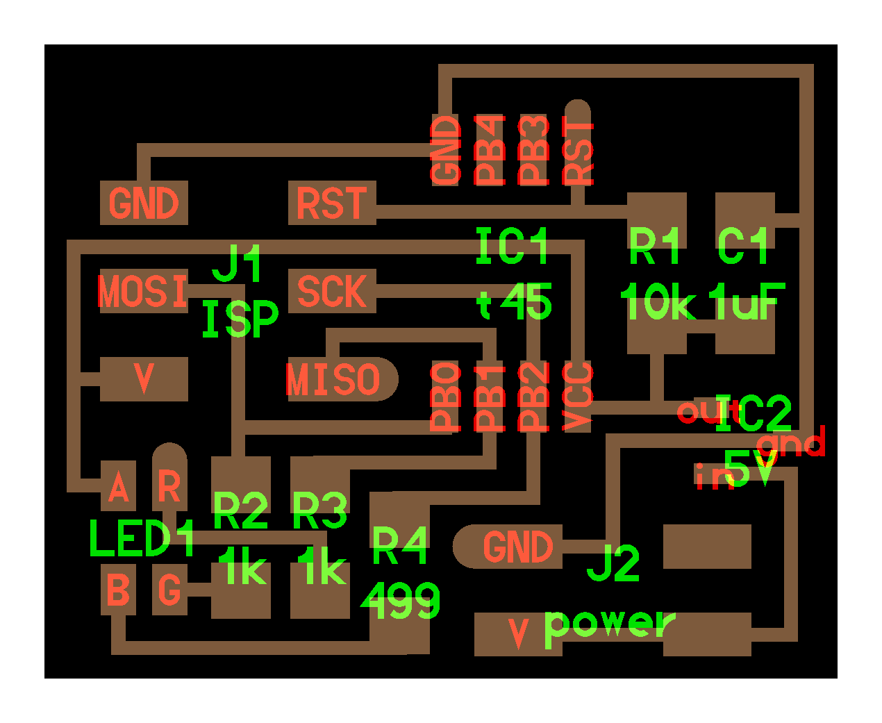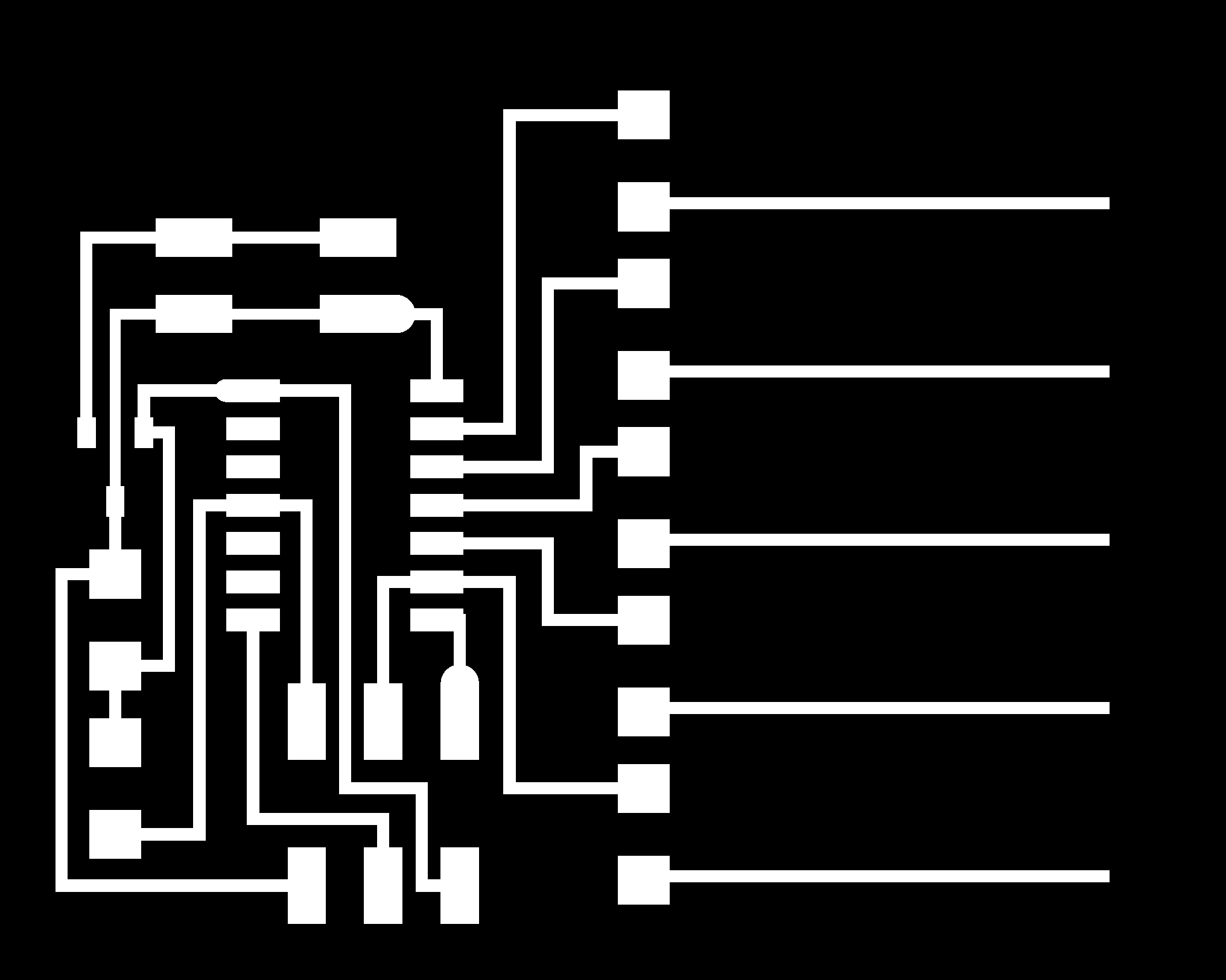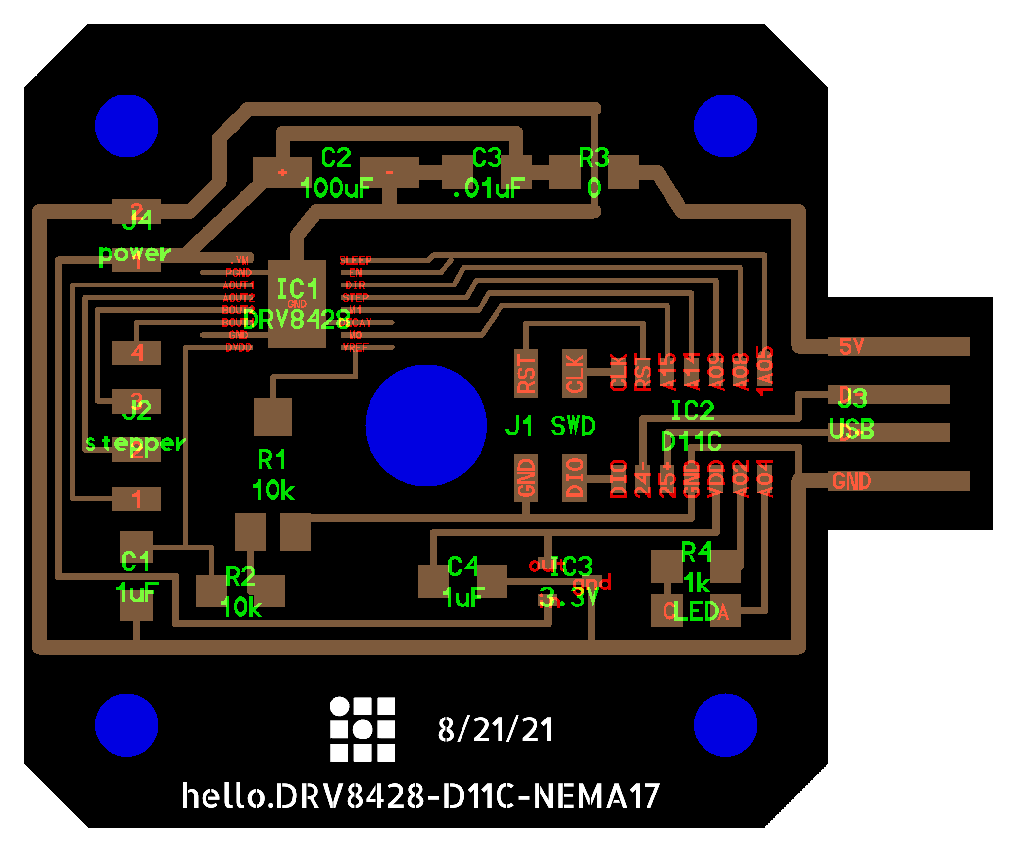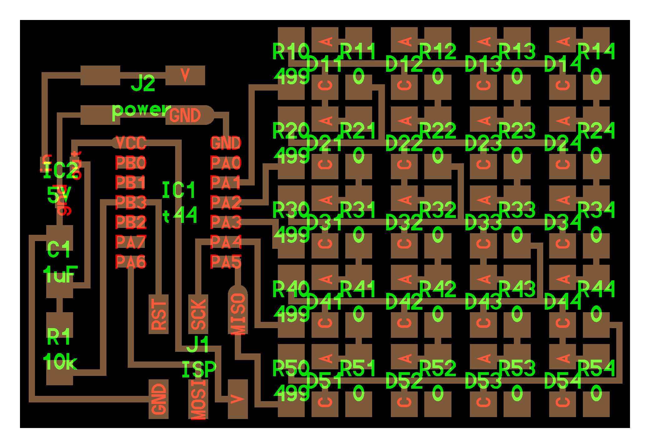 electrical safety ~1 mA: OK ~10 mA: shock, contraction ~100 mA: fibrillation body: M ohm external, k ohm internal dielectric breakdown: ~kV/mm supply capacitors inductive flyback polarity protection diode, MOSFET level shift MOSFET connector polarization, orientation circuit protection power wire gauge USB charger hub battery module meter power supply bench switching, linear, regulated supercapacitor LiPo battery charge controller storage wireless current measurement in-line meter supply regulation sense resistor magnetic field inductance LED current limiting hello.button-blink.C3 board components traces interior hello.button-blink.C3.ino hello.button-blink.C3.py video PWM hello.fade.C3.py video Charlieplexing hello.array.44 board components traces traces+exterior interior C makefile video hello.array.44.2 board components bottom vias top top+exterior interior C makefile video RGB LED pixels lights wires NeoPixel/WS2812B/SK6812 hello.WS2812B board components top interior hello.WS2812B.RP2040.py video Arduino Micropython library 3 in 1 hello.RGB.45 board components traces traces+exterior interior C makefile video LEDs diode drop, series-parallel MOSFET N, P, N floating gates, gate resistors dissipation, Rds, switching BJT, BiCMOS, IGBT hello.LEDs.t412 board components traces traces+exterior interior hello.LEDs.t412.ino video thermal runaway eye safety displays LCD HD44780 library hello.LCD.44 board components traces traces+exterior interior C makefile video I2C PCF8574 library hello.I2C.t1614 hello.LCD.I2C.ino video OLED SSD1306 hello.SSD1306.RP2040 board components top holes interior hello.SSD1306.RP2040.py ssd1306.py video library scripts hello.SSD1306.45 board components traces traces+exterior interior C makefile video TFT ILI9341 library hello.ILI9341.SW.D21E board components traces traces+exterior interior video hello.ILI9341.HW.D21E board components top top+exterior bottom holes interior video ST7735 video E Ink modules video RS170, NTSC, PAL, SECAM, VGA 75 ohm impedance hello.video.44 board components traces traces+exterior interior C makefile video SPI TVout thinner client color DC motor H-bridge TB67H451AFNG,EL TB67H453FNG(O,EL) hello.TB67H451.RP2040 board components top interior hello.TB67H451.RP2040.ino hello.TB67H451.RP2040.py boot.py video hello.H-bridge.D11C board components traces traces+exterior interior hello.H-bridge.D11C.ino video A4950 hello.H-bridge.44 board components traces traces+exterior interior C makefile video Dual H-bridge DRV8847 torque, power, efficiency, gearing vibration heat speaker MP3 module library hello.DFR0299.RP2040 pro sch pcb board components top holes interior hello.DFR0299.ino video I2S MAX98357A library module hello.MAX98357A.RP2040 board components top holes interior hello.MAX98357A.RP2040.ino video PWM class D, library hello.TB67H451.RP2040.audio.ino hello.TB67H451.RP2040.audio.py boot.py video hello.TB67H451.RP2040.wave.py sample.py hello.py convert_byterray.py video hello.TB67H451.RP2040.wave.ino sample.ino sample.main.ino convert.py video hello.speaker.D11C board components traces traces+exterior interior hello.speaker.D11C.ino hello.speaker-registers.D11C.ino video solenoid servo motor 50 Hz ~1-2 ms PWM (dis)continuous rotation ATtiny412 hello.servo.t412 board components traces traces+exterior interior hello.servo.t412.ino hello.servo-registers.t412.ino video ATSAMD11C hello.servo-D11C board components traces traces+exterior interior hello.servo-registers.D11C.ino video ATtiny44 hello.servo.44 board components traces traces+exterior interior ZLDO1117 hello.servo.44.1 board components traces traces+exterior interior LM2940 C (hardware PWM) makefile C (two-channel, software PWM) makefile video brushless DC motor (BLDC) efficiency, density, reliability, noise inrunner, outrunner, pancake, fan, gimbal Kv (RPM/V) phases/rotation (6 typical) drive waveform open-loop, closed-loop control back EMF (BEMF) sensing ~1 (fan), 10 (drone), 100 (skateboard), 1000 (car) A,$ triple half-bridge A4949 hello.A4949.RP2040 board components top interior hello.A4949.RP2040.py video electronic speed controller (ESC) hello.ESC.44 board components traces traces+exterior interior C makefile video firmware servo PWM power input, output initialization, calibration stepper motor types wire identification step size (1.8 degrees typical) full, half, microstepping current, duration field oriented control step and direction DRV8428 hello.DRV8428-D11C board components traces traces+exterior holes interior hello.DRV8428-D11C.ino video hello.DRV8428-D11C-NEMA17 board components traces traces+exterior holes interior code video H-bridge DRV8251ADDAR hello.DRV8251A.RP2040 pro sch pcb board components traces interior hello.DRV8251A.RP2040.stepper.ino video TB67H451AFNG,EL hello.stepper.bipolar.D11C board components top top+exterior bottom holes interior hello.stepper.bipolar.D11C.ino video driver electro-permanent electrostatic motor control Allegro TI Trinamic Pololu motion control solid state relay AC vs DC IC hockey puck wiring voltage drop: ~V safety: switch hot side US: black (red,blue) = hot, white = neutral, green(-yellow) = ground EU: brown (black,gray) = hot, blue = neutral, green-yellow = ground switched outlet shape memory piezo polymer artificial muscle fishing line conducting thread actuator LCE soft inflatable pneumatics hydraulics Lingdong group assignment: • measure the power consumption of an output device individual assignment: • add an output device to a microcontroller board you've designed, and program it to do something