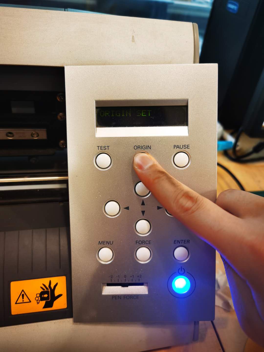 The lasercutter has a auto focus function using a ruler. First we insert the ruler into the right place shown on the picture below. Then we push the auto focus function button. The machine will raise the platform until the material touch the end of the roler and push it a little higher. Because there is a sensor inside the machine and the ruler has a hole to cooperate the sensor. When the ruler is higher and the hole is not at the same position when it isn’t pushed up, the machine will recording the height as the focus position. Then the focus is completed.