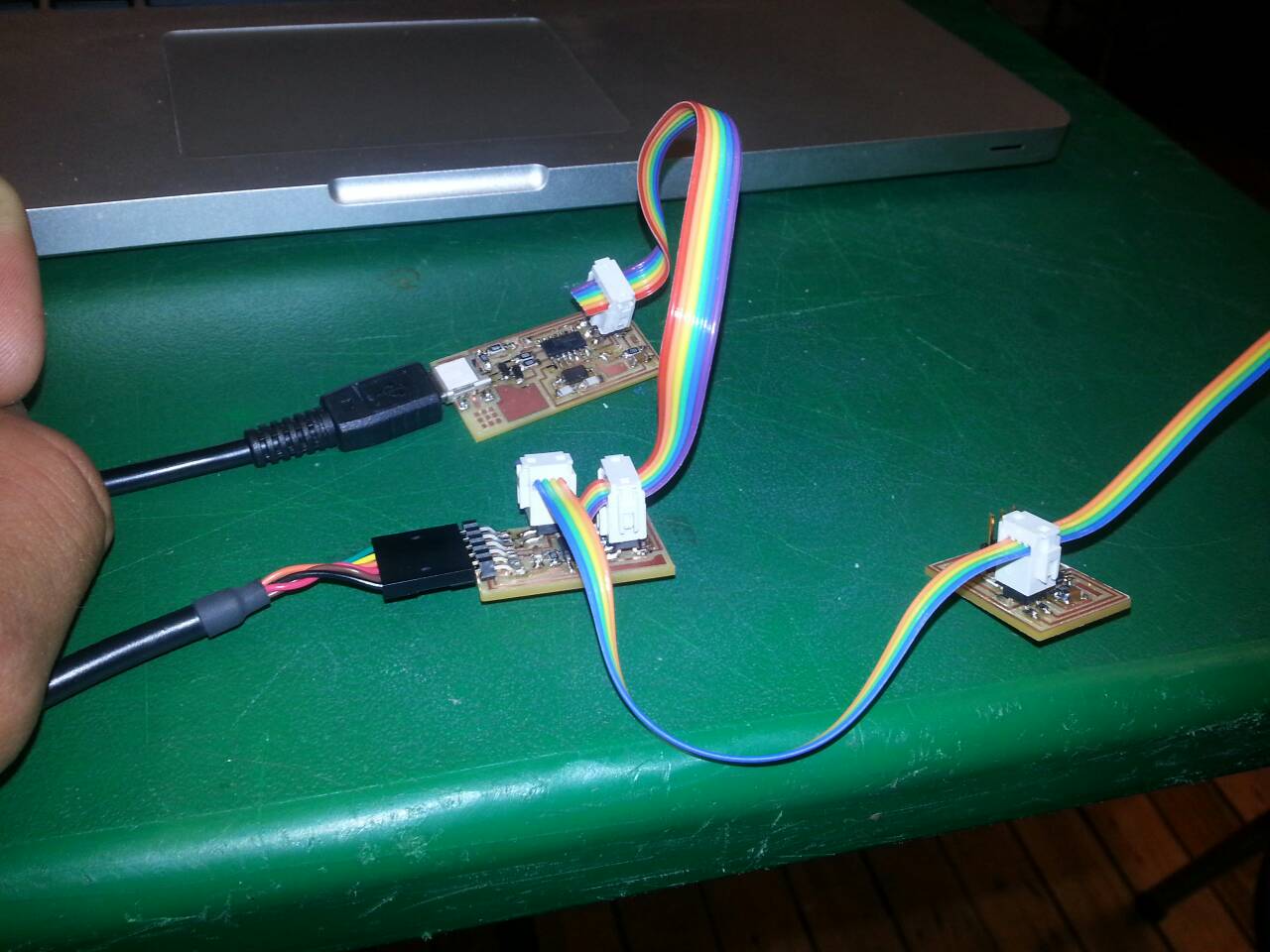 Next, I programmed each of the boards. To do this, I had to flash the code onto each of the boards. I used the code found here, and my fabISP to push the code to the boards using the terminal command: