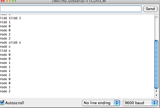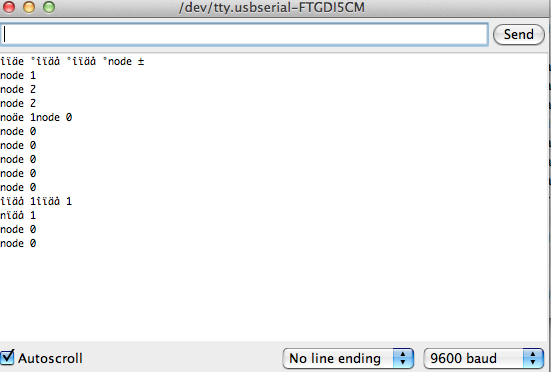 After I programmed the boards, it was time to test them. I opened the arduino IDE, and then opened up the serial monitor. I entered 0 into the command line in the IDE, and all of the boards flashed once, and then the bridge flashed again. Exactly what it was supossed to do! Then I tested node 1 and 2, and they worked as well.