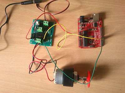 Connection: First connect the red wire from the GND pin of Arduino (red board) to GND pin on the H-bridge PCB (green board). Next connect green wire from 5 of Arduino to any one pin of IN2 on the H-bridge. Next connect yellow wire from 6 of Arduino to the other pin of IN2 on the H-bridge. Connect the motor wires to the screw terminal besides IN2. Polarity won't matter. Next just connect the Arduino board to the computer via the USB cable. It should blink some lights on the board. Don't worry if drivers aren't installed, we just need the power from the computer. Finally connect the power jack to the Adapter and switch it on.