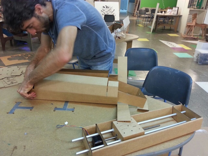 Using the laser machine we cut a wheel from a 4mm wood that fits in a standard bearing and attached it to the end of the upper axis.