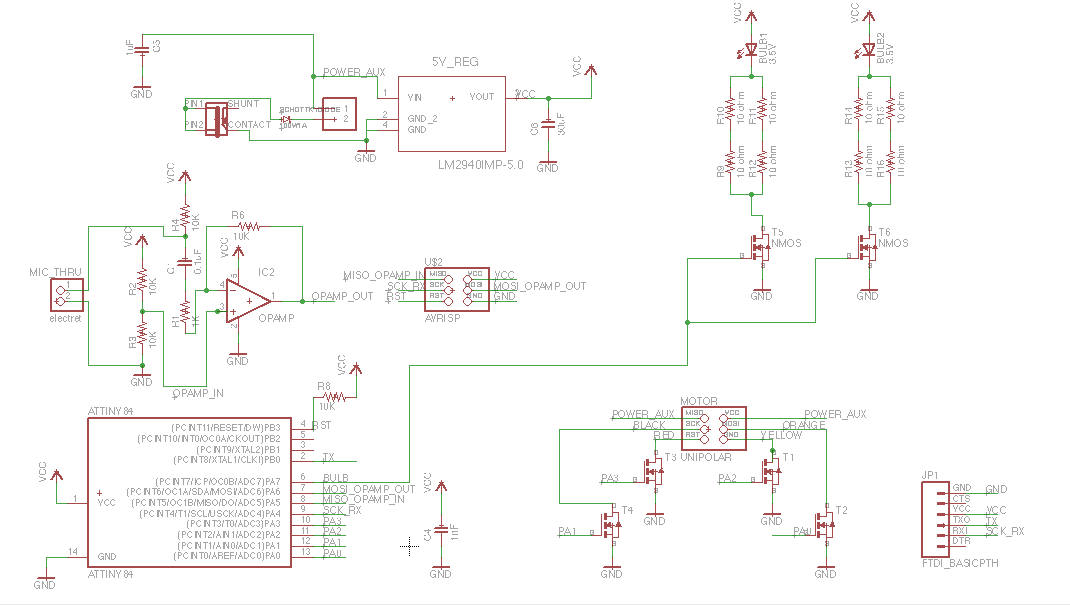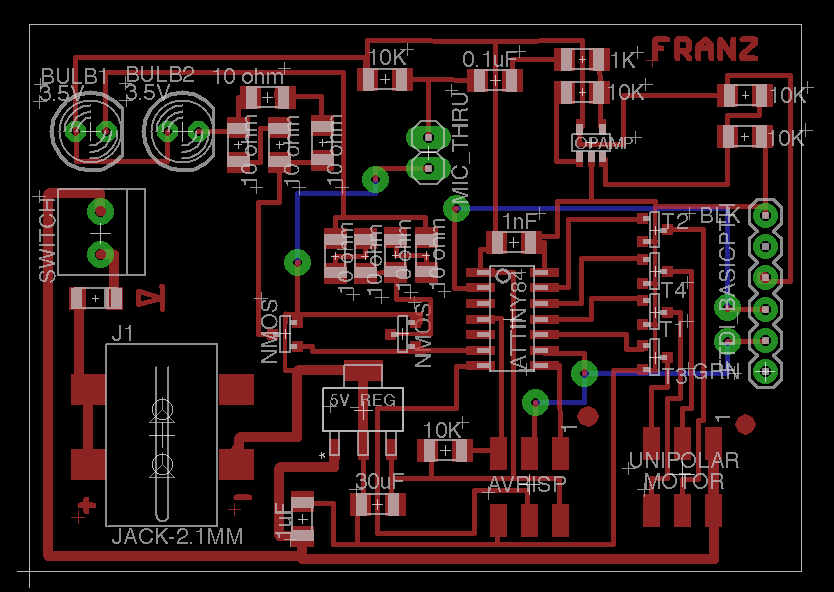 My circuit board design requires an electret microphone as input, and a unipolar stepper motor and 2 incandescent light bulbs as output. I decided to put it on one board because: