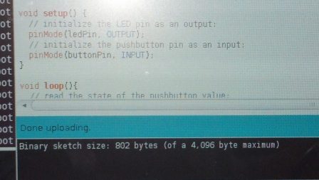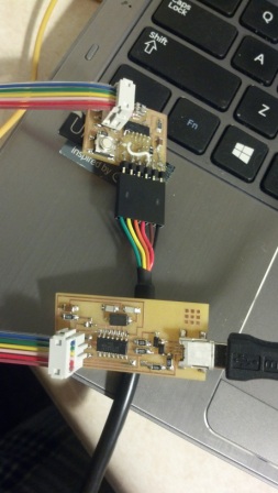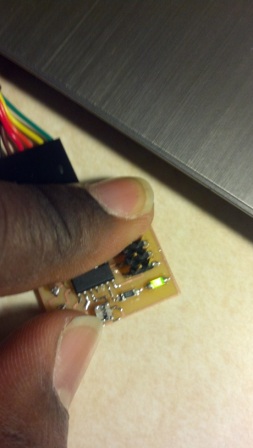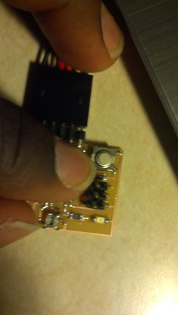 After installing and configuring all softwares and drivers; I connected my fabISP to the computer using the usb cable and then connected my helloworld board to the FabISP and then powered the board using the 3.3V usb serial cable. after connecting them, I opend the programmer ( ARDUINO), cofigured the setting by choosing the correct processor architechture (board), sellecting the correct output port and then sellecting the right programmer. I then opened the recommended example sketch and made the necessary changes to fit my pin configuration and then compiled it and loaded it to my circuit board. the aim of the sketch was to make it possible for an led to light on when a button is pushed on the circuit and after programming the board, it did just that.