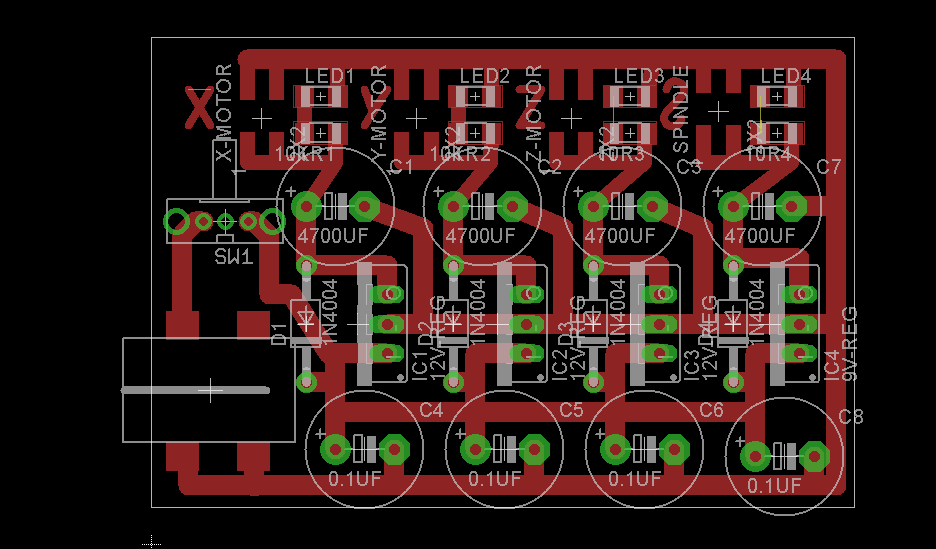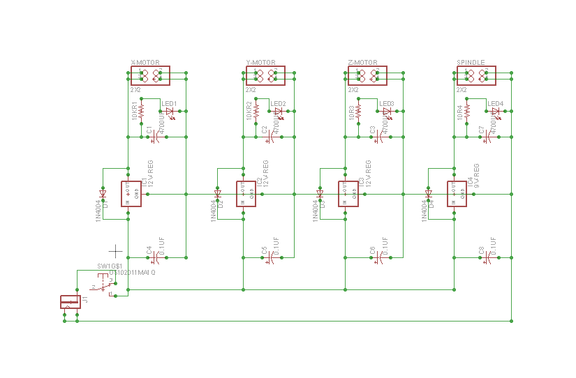 Using Eagle circuit design Program I came up with a sketch of the schematics for the power splitter and the modified version of the stepper motor control and the spindle control.