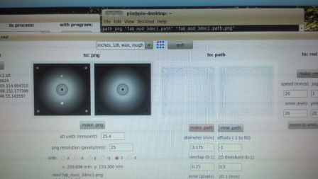 I started this by making simple 3D sketch using the AutoCAD program. After getting my 3D drawing, I saved it as an STL file and then using the fab module in the STL to RML mode. I openned my STL file, checked the size to make sure it is the rigth size and then made a PNG. From the PNG, I then made the part by first sellecting the tool path parameters for rough cutting after which I made tool path for smoot cauuting. I then calculated the tool path and then with my material (wax) in place, I sent the command for the catting process for each face.