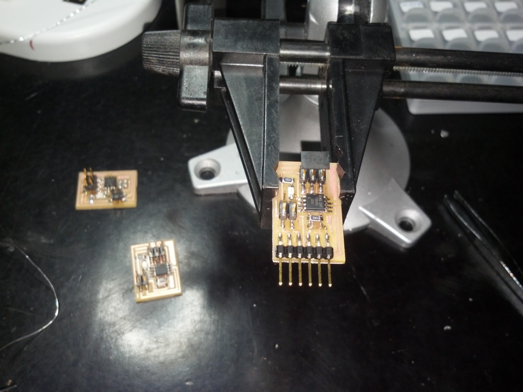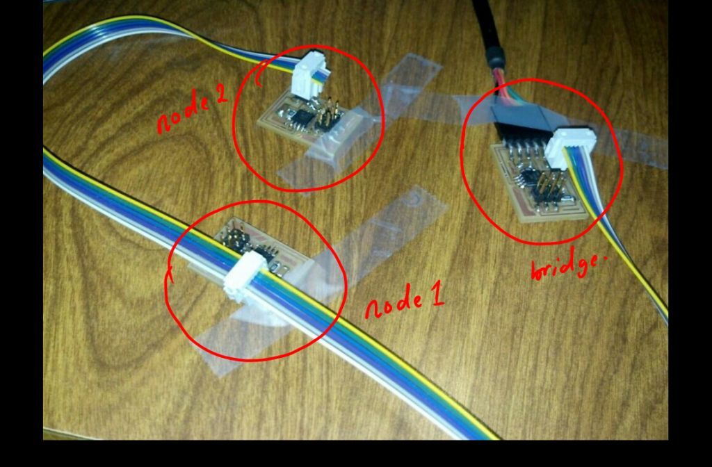 Before doing all that, I had finished working on my circuits. I milled one bridge board and two node. I noticed the difference in the two boards was just the serial interface (FTDI). I milled all three boards using the roland modela, which took only a few minutes to do. After milling the boards, I did all the soldering.