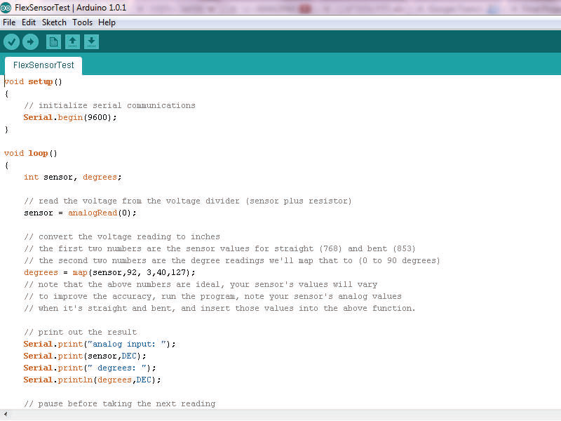 הנגד והחיישן יוצרים מחלק מתח, על ידי יחס שנקבע על ידי שתי ההתנגדויות. כאשר החיישן הוא ישר, הנגד והחיישן יגרמו למתח היציאה להיות כ -75 אחוזים. כאשר החיישן כפוף, המתח יגדל לכ -83 אחוזים . לתוצאות המדויקות ביותר, יש לבדוק את החיישן הספציפי שלך ולהשתמש באותם מספרים בקוד שלך