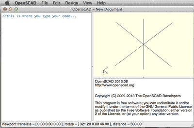 When you open the program it is not clear what you can do: there is literally no GUI. Just, for each document you open, a window on the right where you enter your lines of code, and on the right-hand side a window where you can see the three axes XYZ, and where you can visualize the result of the code you typed.