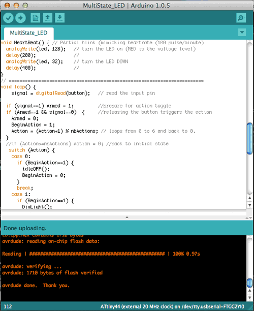 Couldn't think of anything interesting I could do with just a button and a LED, so I thought I'd exploit the two extra free ports on the ATMEL to do something different; but before that lets do a little bit of programming with the LED and button.