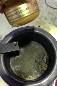 Flux, normaly used in soldering as a reducing agent to prevent oxides from forming on the surface of the molten metal, acts as a sponge that absorbs impurities into the slag which could be scraped off the molten metal. Add a teaspoon for 40ml of molten metal, and the impurities will precipitate to the surface→.