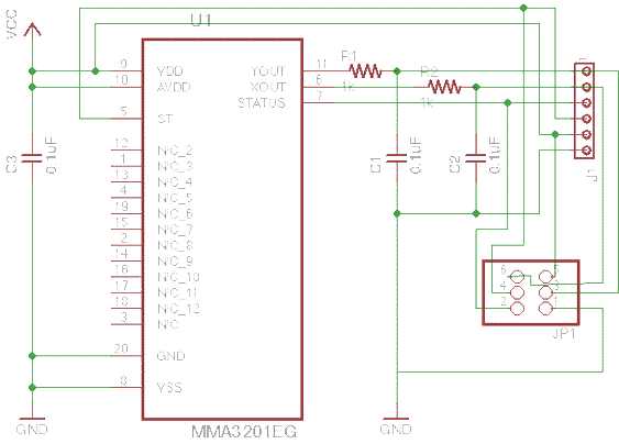 The MMA3201KEG is straight forward. Despite boasting 20 physical pins on the chip, only 8 are actually connected and four provide data as a feedback: