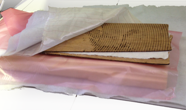 - Upper slab (as much as you can, you want the concave part of your final objectto be facing down: Your mold should be convex) → Paste resin on the face of the slab that will bond with inlay fabric