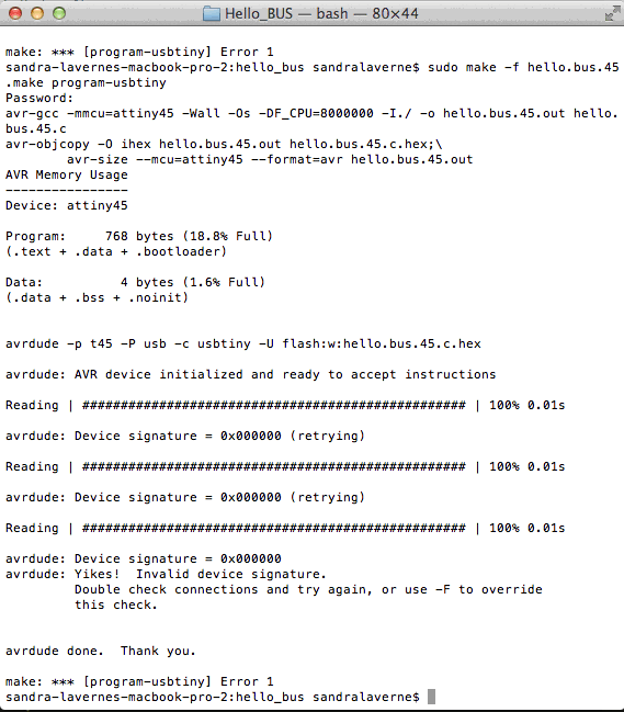 I was able to scavenger 2 ATtiny45's from fellow academicians and finally got to load the program onto my nodes with the terminal. Each node is reacting as expected with the led flashing in RED.