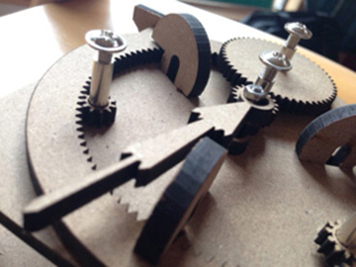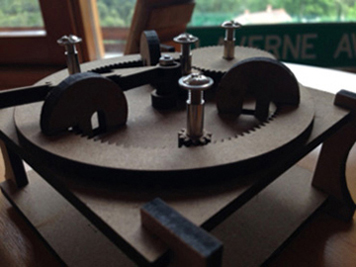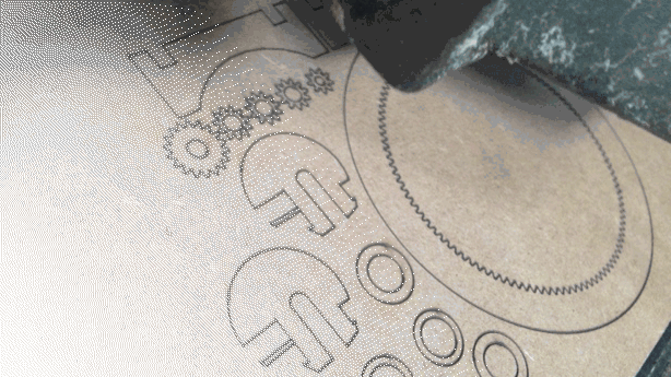 I chose a sheet of 5mm DM to cut out my gears, and the result is pretty amazing: the gears really engage smoothly with one-another.