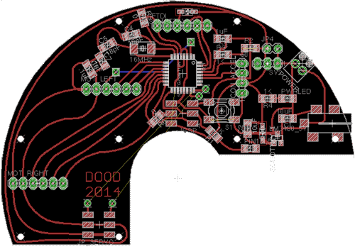 The board is based on the Mat2ino which itself is an offspring of Barduino. The board is designed to use only the ports that are required by DooD (4 pins for each motor, 1 pin for the servo, 3 pins for reading the accelerometer data)