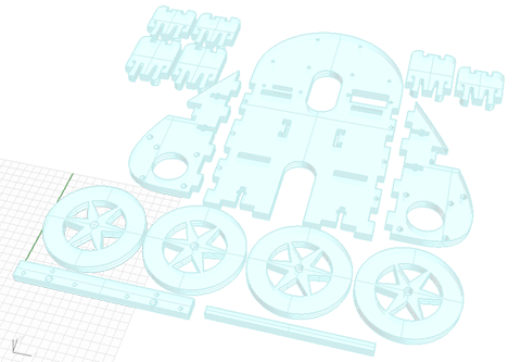 The body is made from a laser-cut 4mm thick sheet of plexiglass. The different parts of the body are assembled in three different ways: