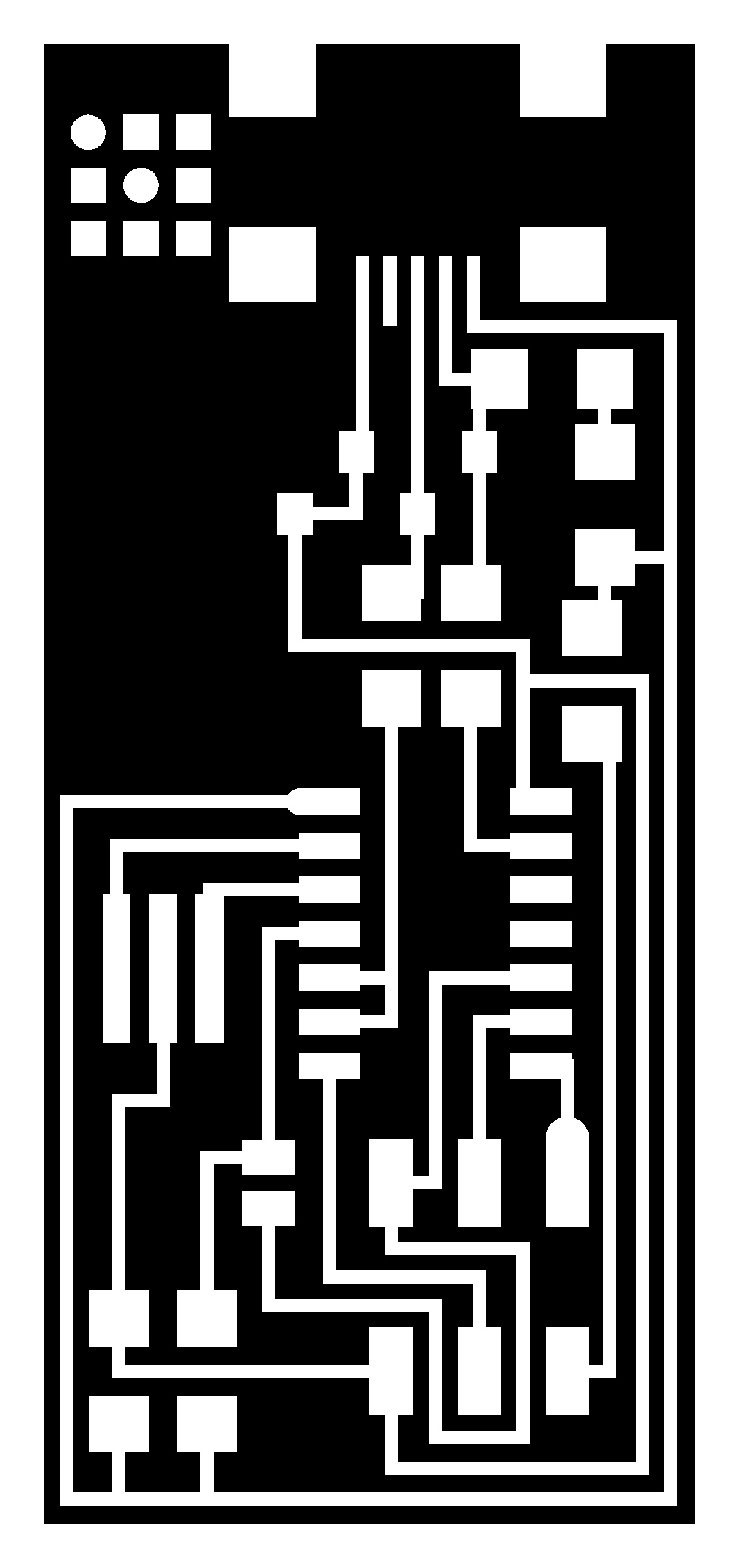 With the Traces file I set the milling machine to the 1/64" endmill and milled the inner traces of the PCB. After that I changed to the 1/32" endmill, loaded the Interior file and milled out the board.