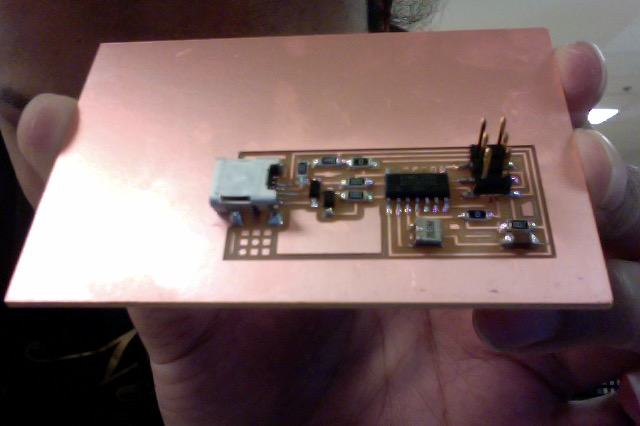 Use the fabmodules to convert the .png file of the traces to an .rml format, set up the machine, and mill... We are using the Modela MDX-40A... and i figured i would mill 2 so one could be for solder practice... FAILED to cut out the outline on both, and so i kept going and decided i would come back to figure out why the cut out was not working. Stuffing and testing as i go...
