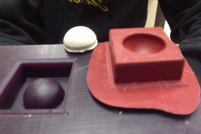 Using carpet tape, stuck the machinable wax onto the plate inside the Modela, had to re-calibrate for the height of the wax, chose a 1/16 bit endmill, and milled out a couple. i noticed that the size was about 1/3 of what i thought it would be based on the fab module translation from units to mm. After successful milling, read the instructions and used MoldMax 60 to create the flexible mold. It took 24 hours to cure, and (after a long, sleeples night) voila!