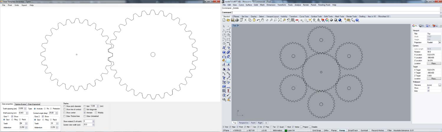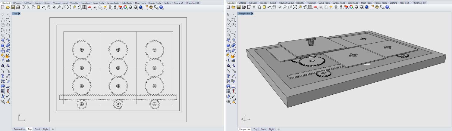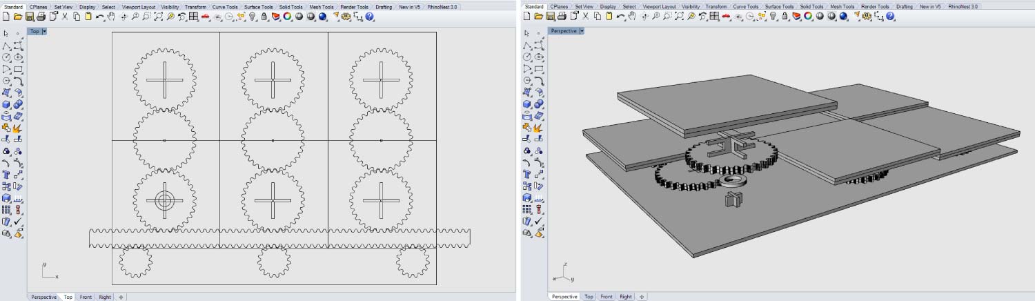 I started with a basic model in “Rhinoceros”. This is one of the CAD software with which I feel more confident. The system consisted in a basic rack and pinion that allows me to rotate the polarizer panels in a circular motion from the linear motion of the rack.
