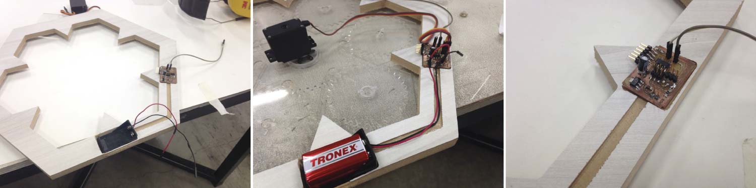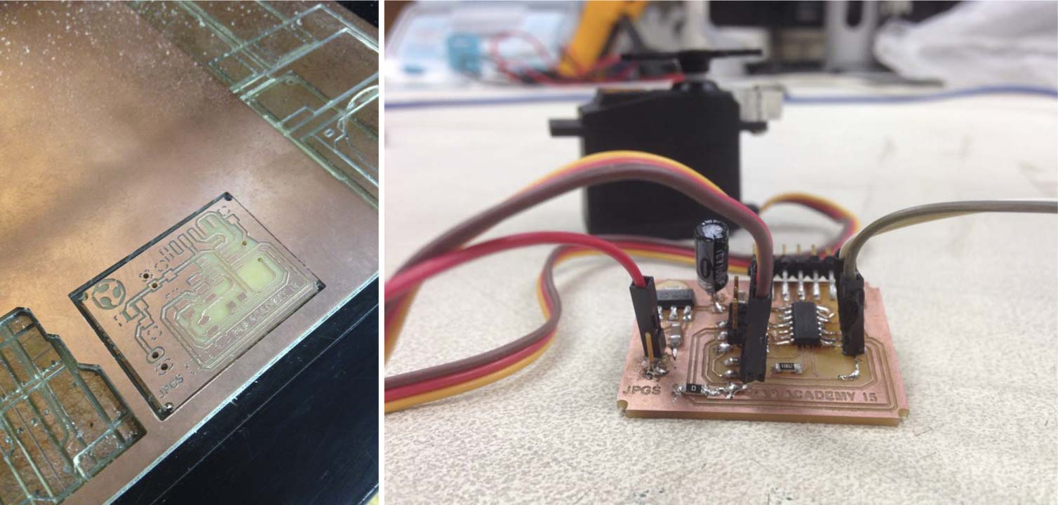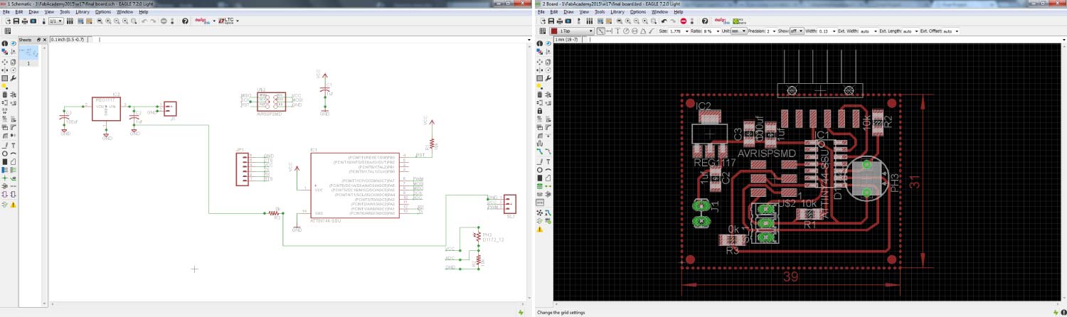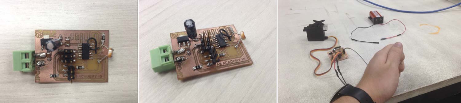 In Week 10 (input & output devices) I moved a servo with a photoresistor as input. That board was the base of the final board. The components remained the same but I added a few components to connect the whole system to a 9v battery or a battery charger in any outlet. I added the next components: (1) REGULATOR 1117 5v, (1) CAPACITOR VALUE 100uf and (1) CAPACITOR VALEU 1uf.