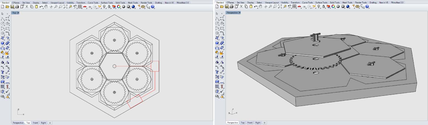 With the first prototype I could improve a lot of things, the number of parts reduced radically, and the system itself works better. I continued drawing in “Rhinoceros” thinking in on how to make a module that could be associated with others modules.