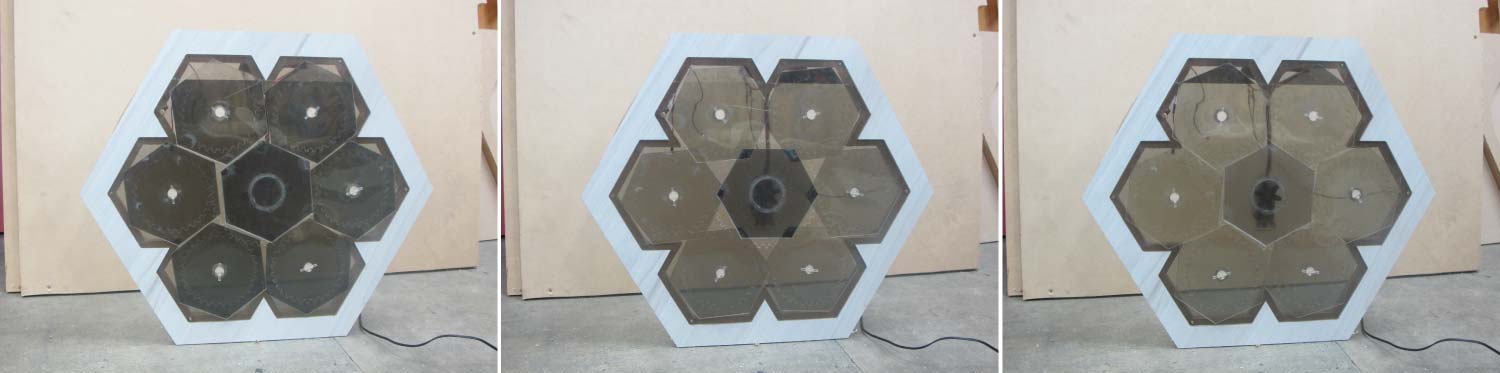 As I said before I “fired” having a lot of things to solve, but this prototype helped me to have things clear, realize what parts were not working correctly and think how to make it work. The images below are pretty clear, I had to work hard to correct all the mistakes of this model. Major errors of this model were: the joints were too fragile, the panels were not enough close to the base and the polarizer effect was not as I imagined. The panels were no attached to the base and fall down . The axis didn’t were aligned... among others.