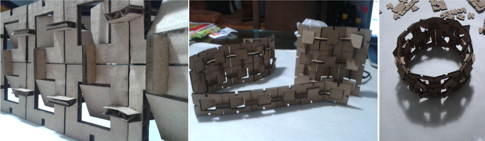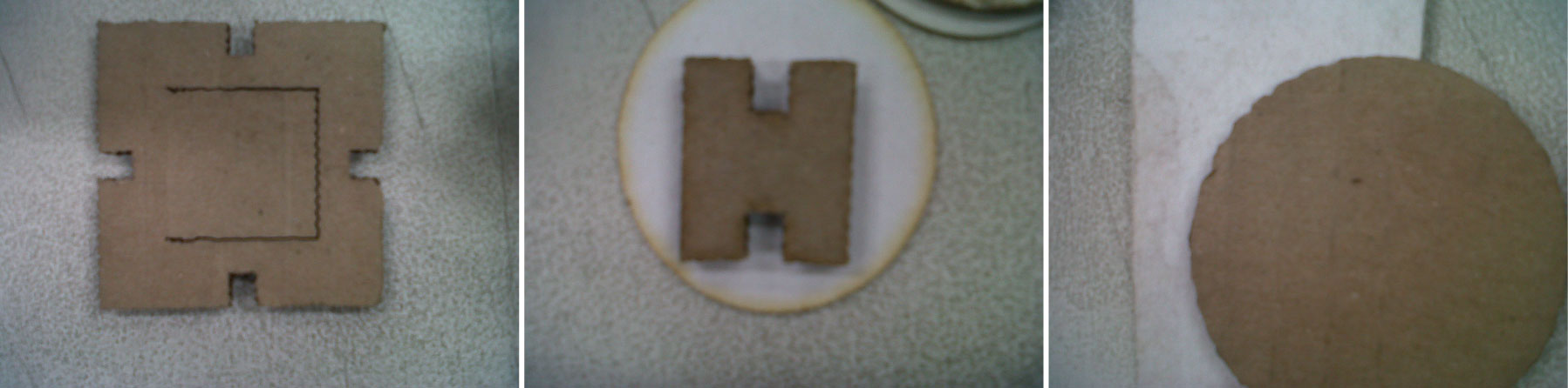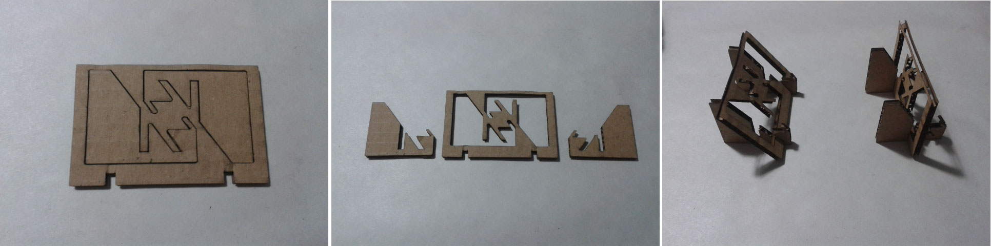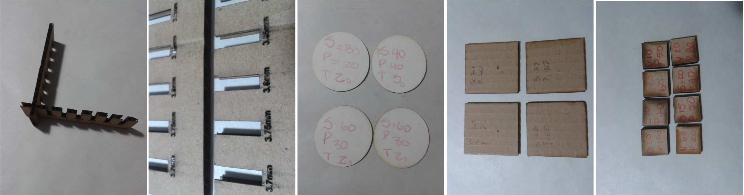 Next step was find the proper material thickness for cardboard. Following Neil’s advices I use cardboard because of its mechanical properties... a good and cheap material. With my classmates made thickness test with different parameters and found that 3.7 mm was the most appropriated. Also we make different material tests. For the cutting files, the optimal extension file in our machine is .dxf. You can draw in any vector software but export it like .dxf. The format used was 30 cm x 60 cm. because there was a few leftovers of sheets of this dimension and i wanted to recycle and aproach the materials available in our lab. Even if the laser cutter is 80cm x 70cm.
