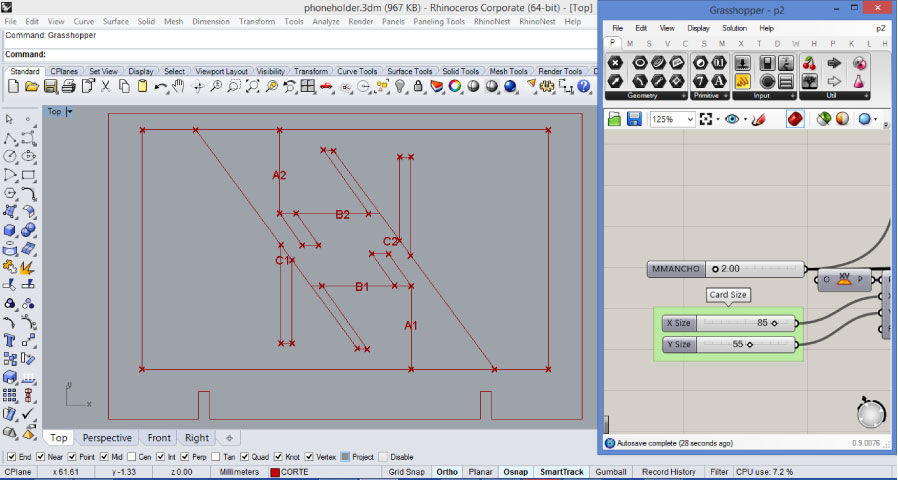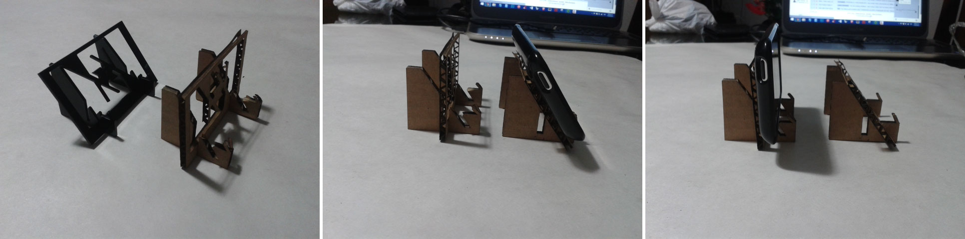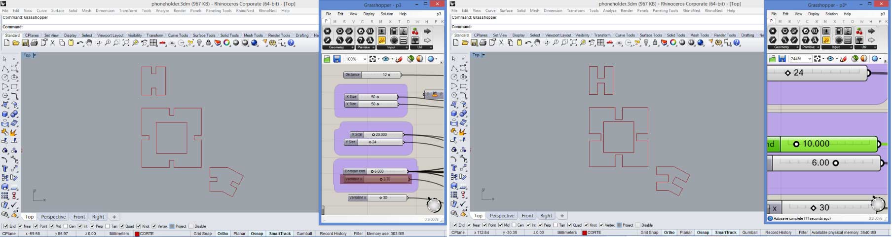 In the last month I had something in mind, the cellphone has become indisputably in a daily accessory. We search information, we make video calls, we record videos, etc. But, sometimes you need to use our hands for anything else instead holding the cellphone. That’s why I think in a “Phone Holder” with the size of a credit card that fits in a wallet and could be assembly and disassembly easily. The software used was grasshopper to easy control the material thickness and the card size. The definition don’t go perfectly but I’m in the process to make it better and easier.