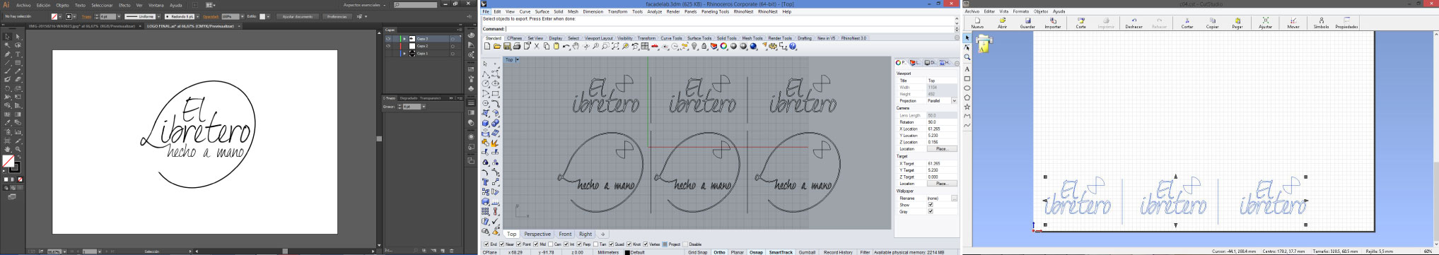 Also I decided to make the logo for “El Libretero” my small company. The logo was designed in illustrator and then exported to Rhino for easy manipulation. The settings were equal from the Fab Lab logo.