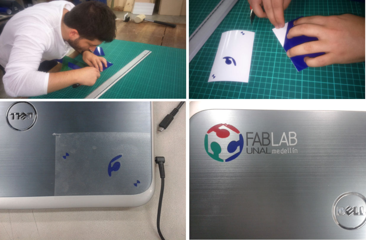 I had no experience before using the vinyl cutter and I found there’s a bunch of possibilities, multiple colors and multiple textures. The Roland vinyl cutter, it’s easy to set up. Basically you need to feed the machine with the vinyl according with the guides. The machine measures the dimension of the vinyl to cut it properly. We had in mind with my classmates to make the Fab Lab Unal Medellin Logo for the entrance of the lab, but time didn’t play in our favor and we couldn’t make it. But it’ll be done in the next days. Then we decided to make little logos for our pc. There was a little difficulty with the small letters of our logo, but at the end I think it looks fine.