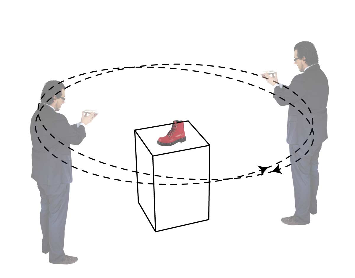 In both (123d Catch and Kinect Scanning) we will follow some similar recommendations, even if the Kinect is based on Laser Scanning and the 123Catch is based on photogrammetric techniques. For scanning a solid object turn around the element as in the image above keeping the scanner in the same position. We also can change the scan position but try to scan the object in a continuous line.