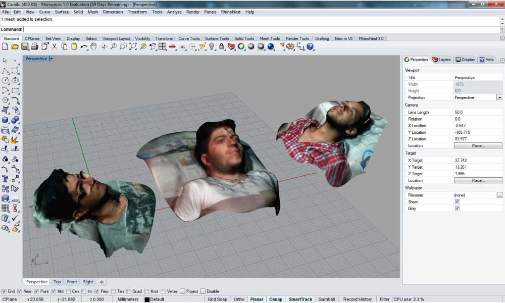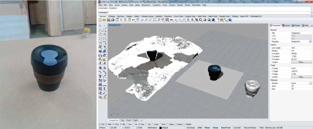 I quickly scan my tutor’s coffee cup, a simple object considering our printer limitations. The coffee cup was an object that could be easily printed without spending much of time on it. I downloaded the model from the 123dCatch web, and opened the .obj file in “Rhinoceros” to clean the meshes, cap some holes and let it ready for the 3d printing process.