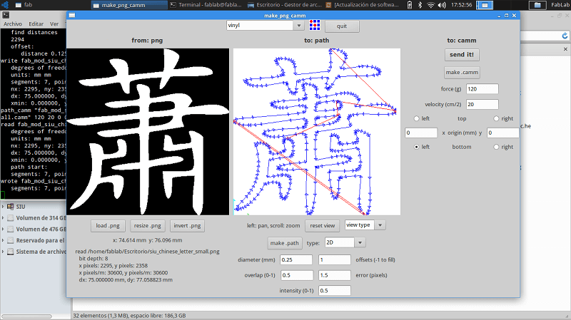 To try the vinyl cutter, I decided to do something quite simple: my surname in chinese. I just downloaded the picture from internet and tweaked it a bit using CorelDRAW to obtain a nice .png at 600dpi. With it, I used fabmodules to create the path for the machine. Fabmodules, both the old and the new one, are very intuitive an easy to use.