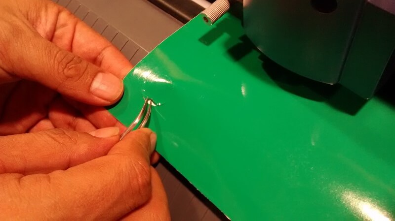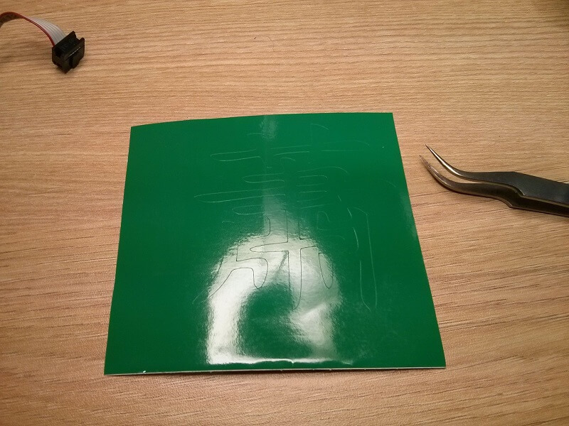 To determine the ideal force and velocity, I did a quick test using the cutter programmed test mode. What it does is to cut a small circle with a square inscribed, using a selected force and velocity. The idea is that if the circle can be removed using tweezers while leaving the square pasted, the settings are good to go. My first try was with force=120 and velocity=20, which wasn´t enought. The second try with force=130 and velocity=20 worked out well.