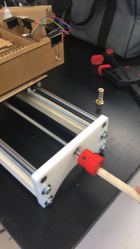 There are a few things I could do to improve my design. Firstly, I could increase the outer circle diameter so that there will be a larger rotation, hence making it even easier to turn the knob. Also, I could put increments in mm so we could measure how much the axis is being turned. Another thing that could be done is smoothing out the knob once it is printed and also attaching something more durable than a wooden dowel (something made of metal perhaps) and also glue the piece in, not just relying on the space where it fits. So there are multiple steps I could take to make the piece better to help the overall function of the machine.