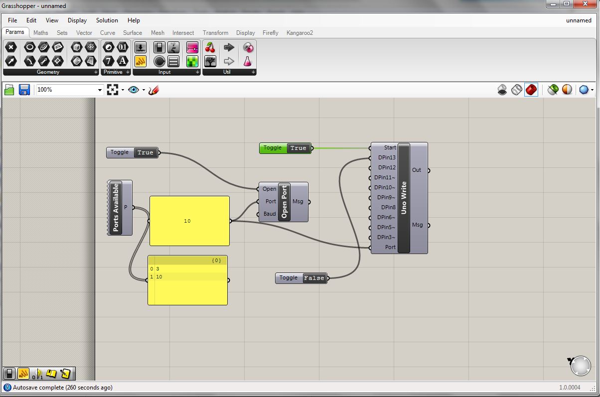 The first essential node to get the firefly interface up and running is the "Ports Available." The output is simply connected to a panel so we can see the results. From that we can see that ports 3 and 10 are available. I"m not sure if there is a definitive way of knowing which port is the one hooked up to the board without just trying to connect and see which one works. Anyway, I had just uploaded the Firmata firmware through Arduino IDE so I knew it was port 10. I created another panel containing "10" to input as the port variable on other nodes. Next we create the "Open Port" function. It has three inputs, the port (number 10), the baud (set to 9600 by default), and "open". The open variable takes a boolean state, true or false. If true, and the other inputs are properly selected, the port should open, creating a communication link between the board and the grasshopper interface. This set of modules really stand on their own and are simply to open communication. The next essential node is the "Uno Write" function. This function gives us access to digital pins 3-13 not including 4 or 7. Pins 11, 10, 9, 6, 5, and 3 have built in PWM capability as well as the standard High or Low, 0 or 1, true or false, boolean binary. Of course we are not using an arduino uno, but because we've programmed the satshakit board with the arduino bootloader, and it uses the same Atmega chip, everything works smoothly. I'm sure there is a way to dive a bit deeper and set up the firefly environment for other boards, but thats a bit beyone my reach right now. I just want to get a basic, proof of concept blink going to I know everything is working. To do this I create a boolean toggle and connect is to pin 13, which is attached to an LED. Indeed, when I toggled the button to true, the light turned on. I was surprised by how satisfying pressing this digital button and seeing a light on my board come on was.