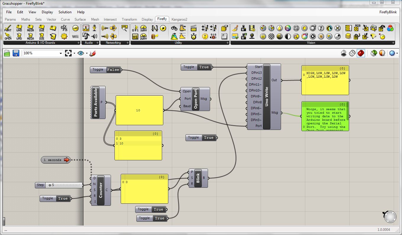I am going to try yo use a program called firefly that connectes the arduino environment to Grasshopper, allowing for live control of a microcontroller through Grasshopper and vice versa. Thought this sounded very interesting, so I downloaded and installed it, following the instructions layed out here