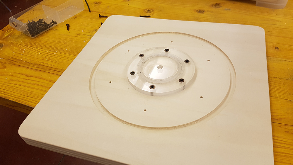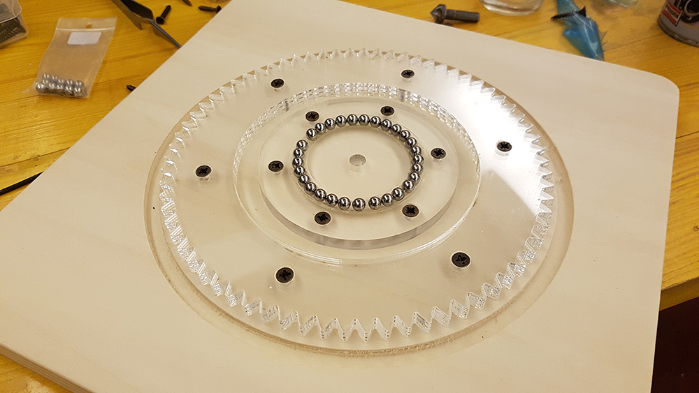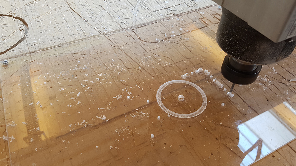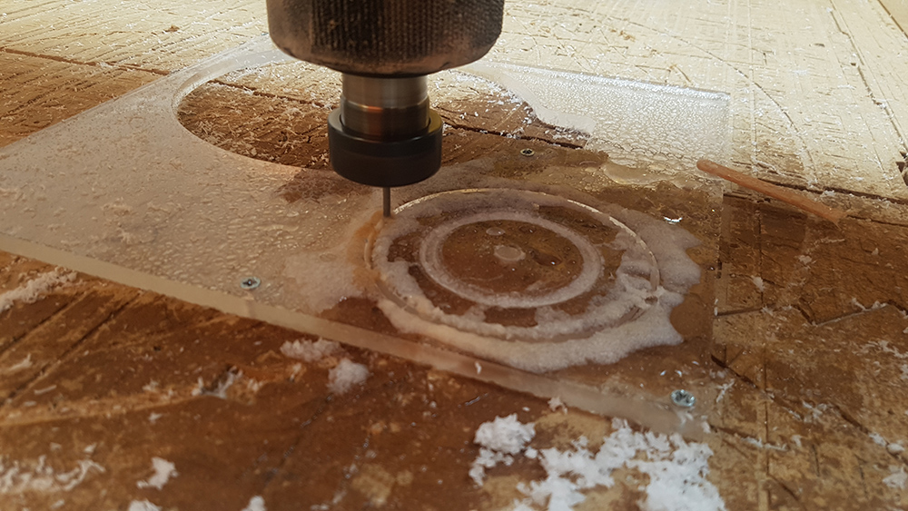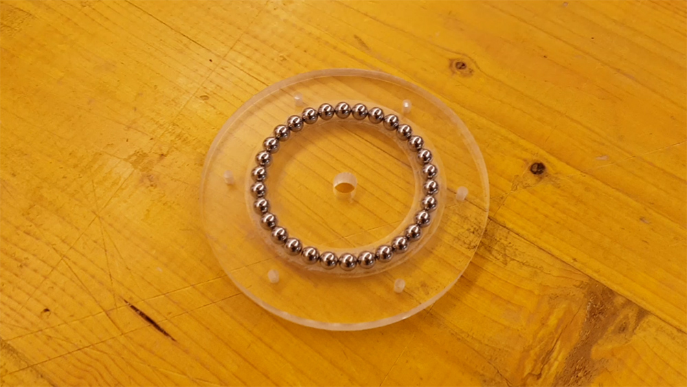 In order to avoid buy expensive bearing, I decided to build one by myself. I prepared on fusion the cam processes for the milling on Shopbot. I bought steel spheres with 6,35mm diameter, and I milled a circular groove on the two parts of the base, with plexiglass 8 mm thick. I used water to avoid overheating of the tool.