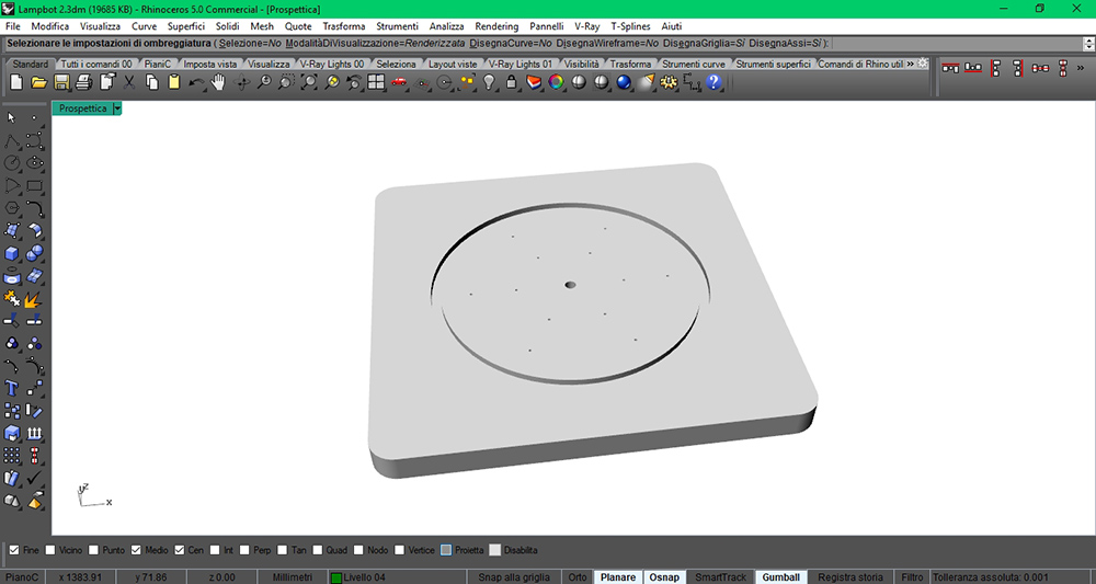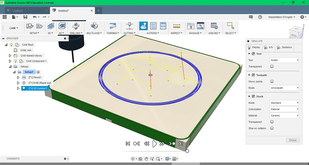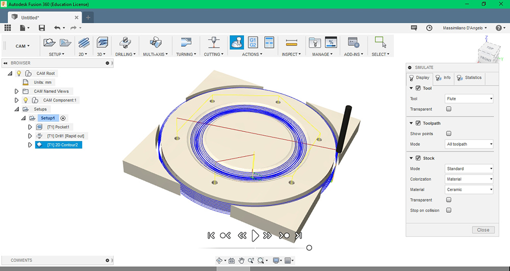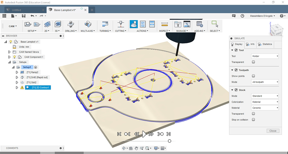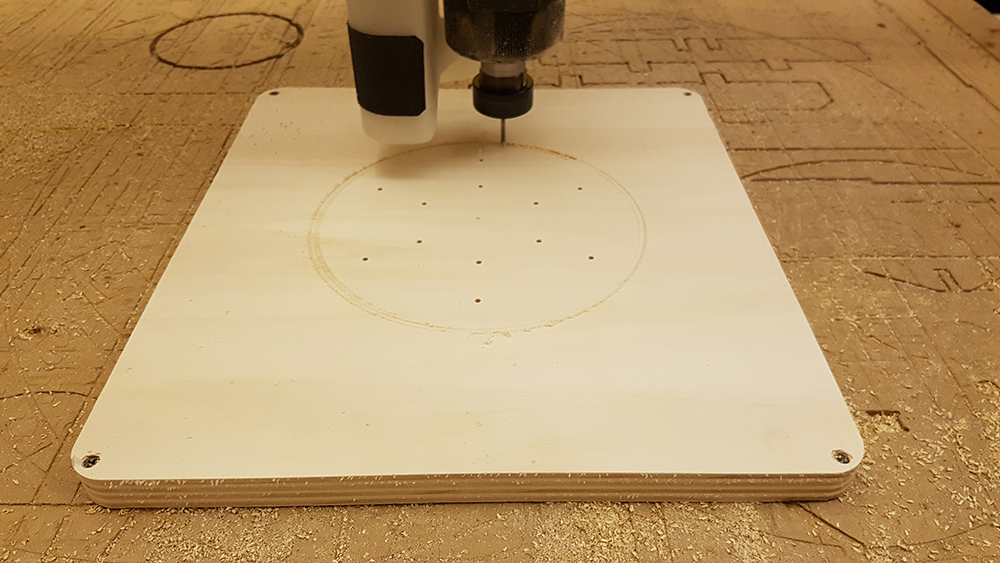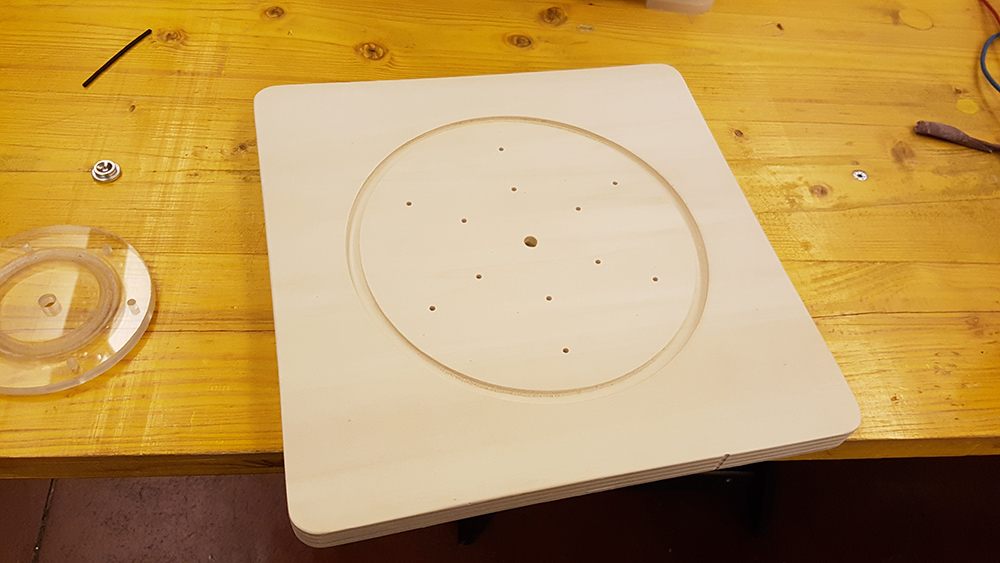 In order to avoid buy expensive bearing, I decided to build one by myself. I prepared on fusion the cam processes for the milling on Shopbot. I bought steel spheres with 6,35mm diameter, and I milled a circular groove on the two parts of the base, with plexiglass 8 mm thick. I used water to avoid overheating of the tool.