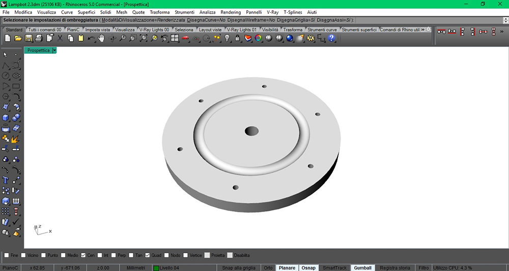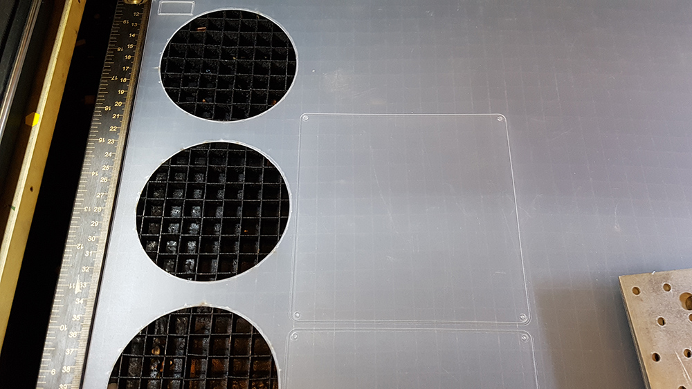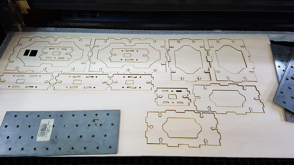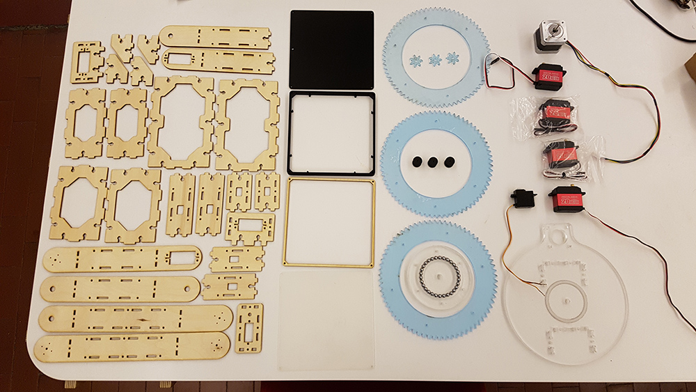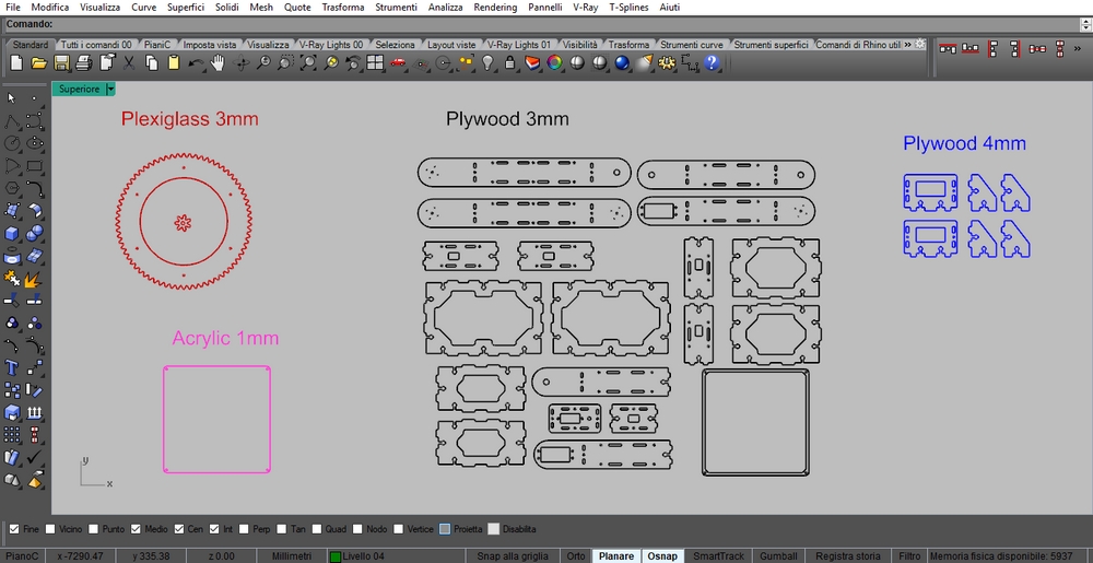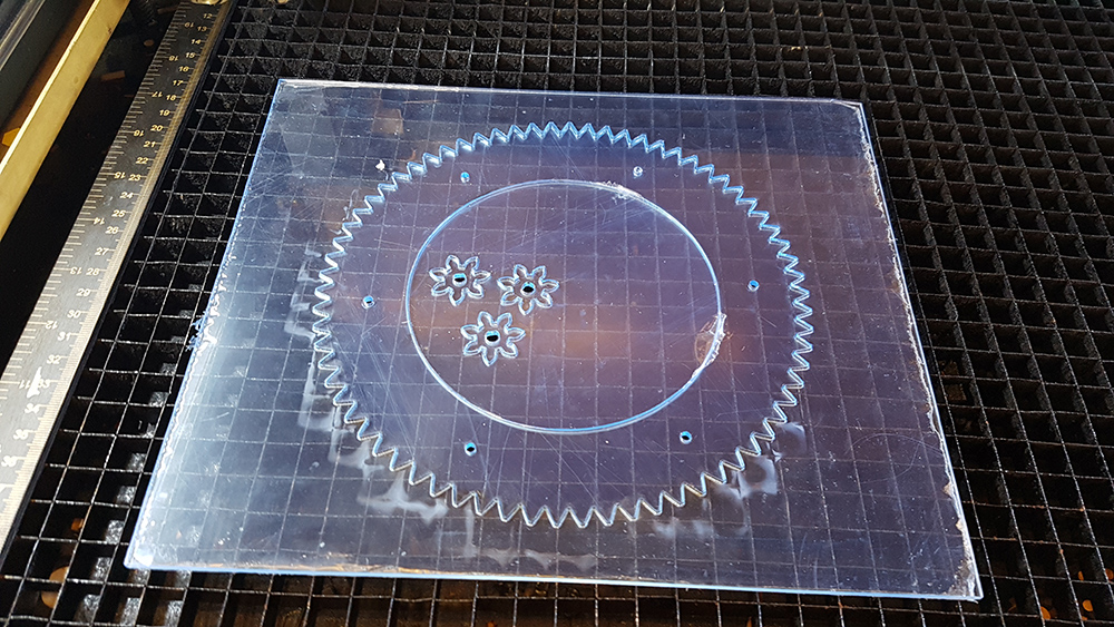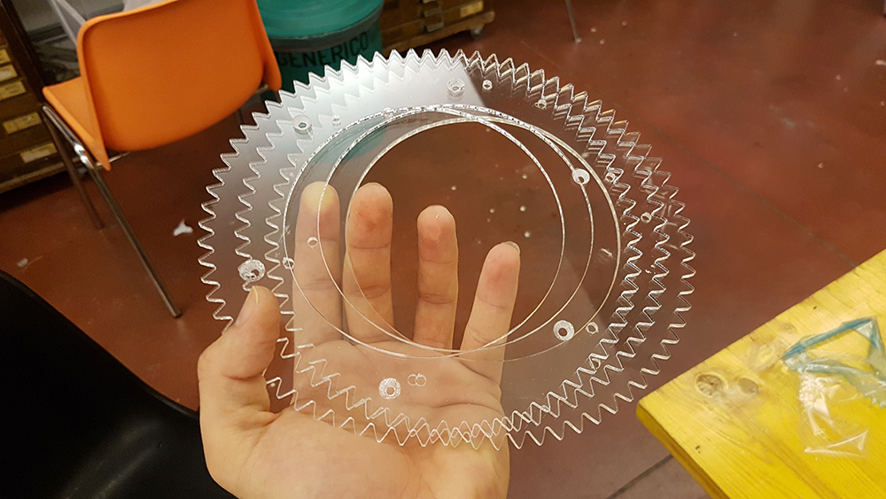 I prepared the dxf files in Rhino and I started to cut the pieces of my lamp's frame on the lasercut. I used 3 mm plywood for lamp frame, 4 mm plywood for the the pieces of servo motor holders at the base. Then I used 3mm plexiglass for gears and 1 mm opaline acrylic for the diffuser. I cut 3 pieces for each gear to reach 9 mm thickness.