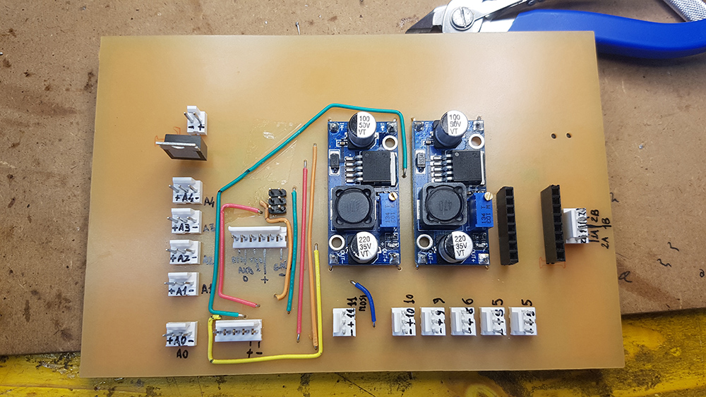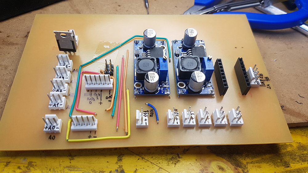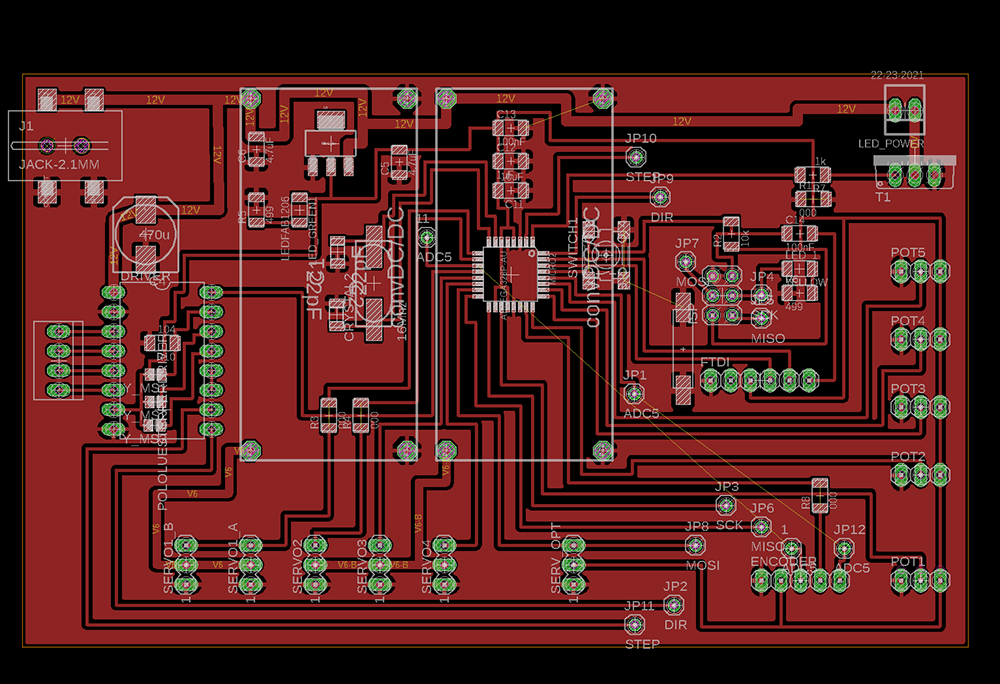 Now was time to made the electronic board. I designd it in Eagle, by this time I was a very expert in Electronic design. I start from satshakit by Daniele Ingrassia. I choose to use through hole pin header connectors, because they are more resistant that smd ones. I used both the faces od the PCB. On the face with copper layer I put all smd components and the reset button and status and power LED. On the other side face I put all the connectors and the DC /DC converters, so that i can use just this face for all the connections. I needed DC/DC connectors because the servos works at 6,5 Volts and have absorption peaks until to 1.0 Ah when i quickly change the direction of rotation. So I buyed two LM2596 DC/DC converter that can reduce voltage from an input 4 - 35 V to an output 1.23 - 30 V and support until to 3 Ah. I setted them to work at 6,5 Volts, that was a good tension for my Servos.