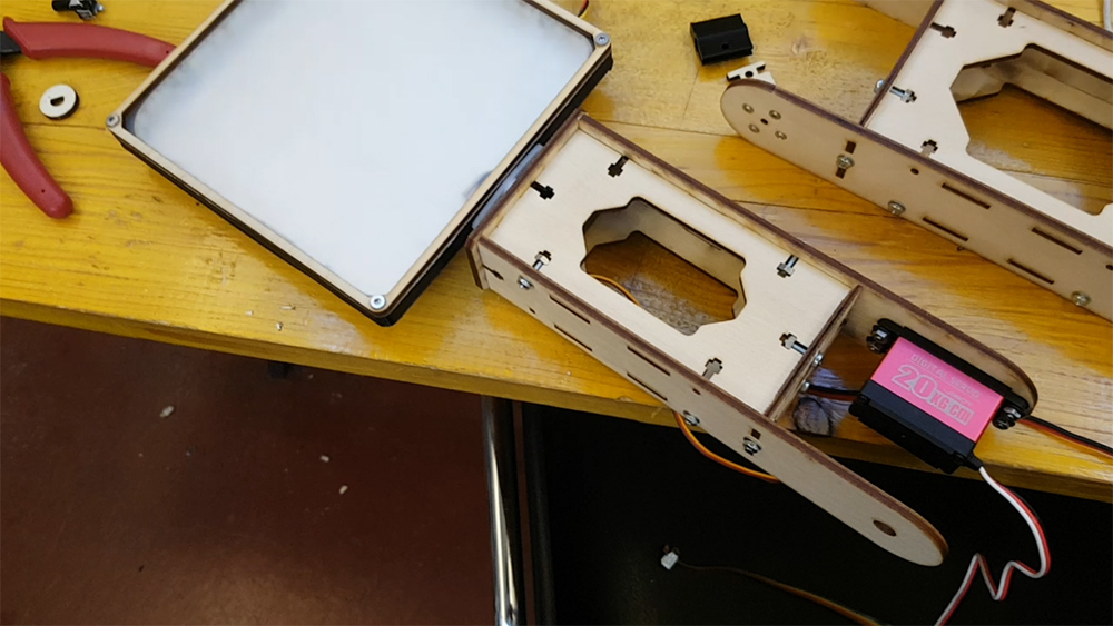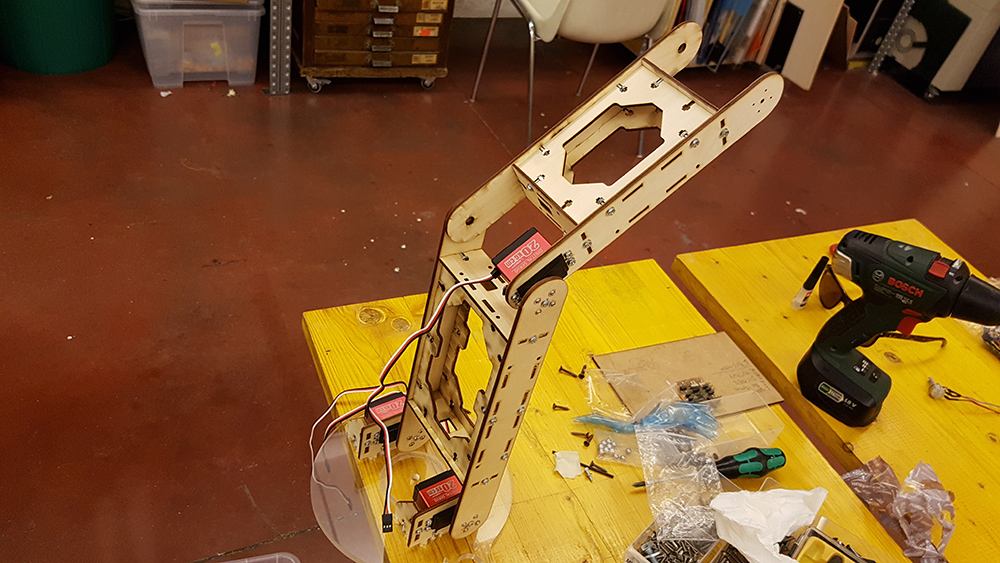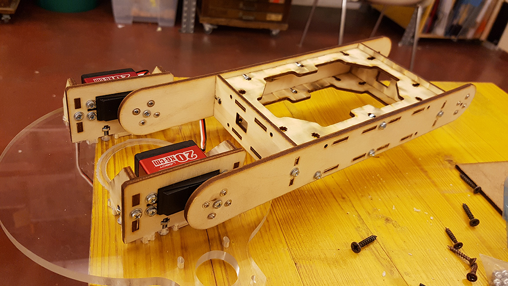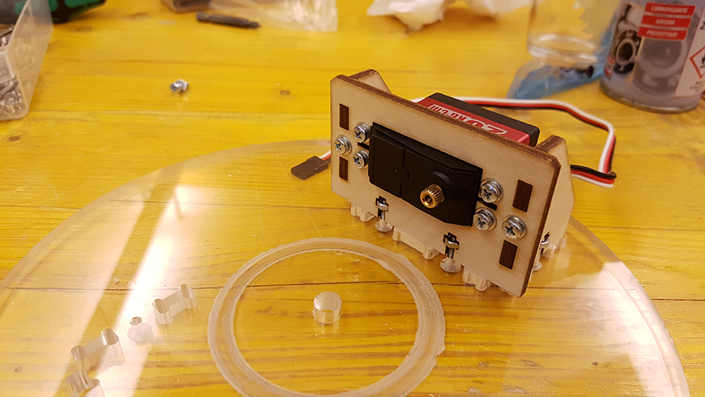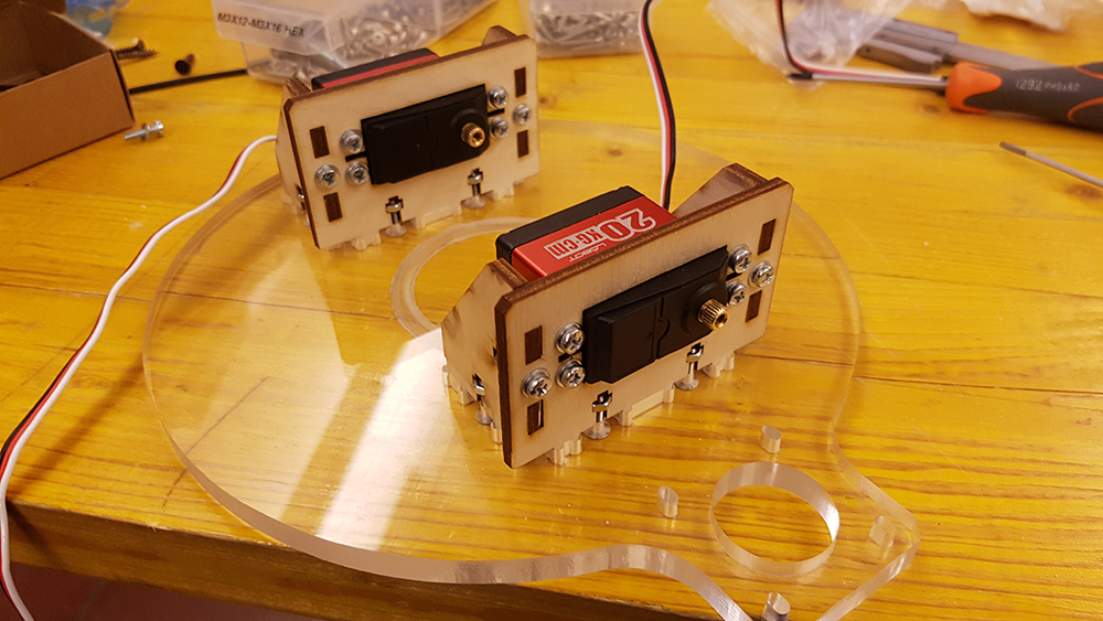 After fixed base, i aseembled the first servo motor holders on the revolving plate at the base.