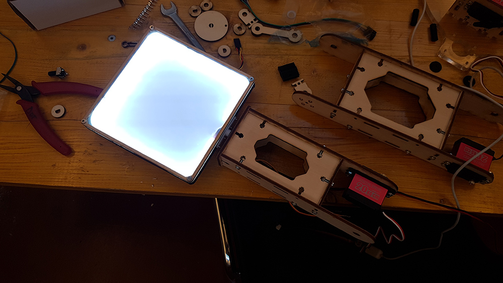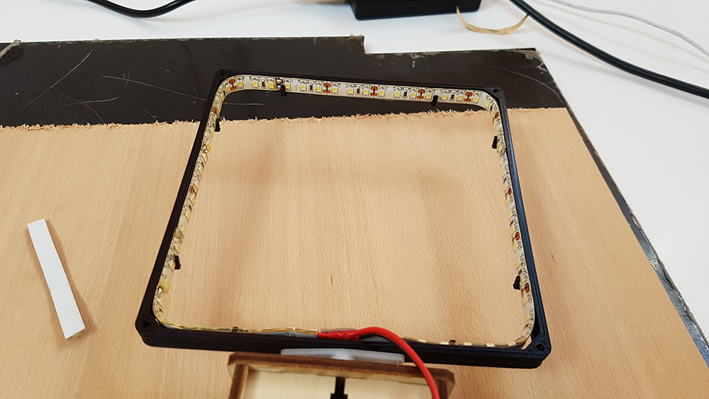 On the frame of diffuser I attached the stripled. I used the system that is used in LED panel tecnology. That allow me to obtain a soft and uniform light, very close to a little soft box effect. So I put the opaline acrylic piece on the front of the diffuser.