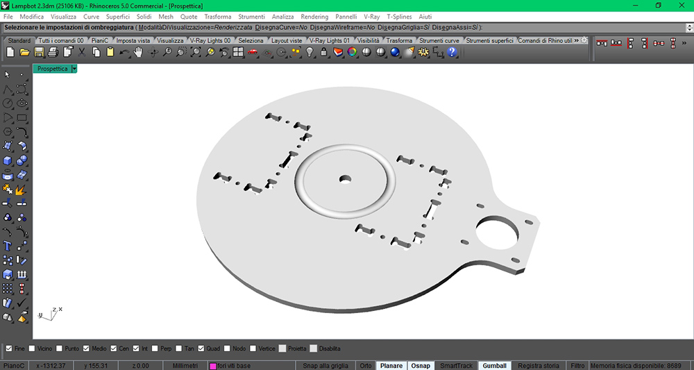 After that, I designed the controller. I used the same linkage and proportion between arms as on the lamp, but here I put potentiometers in the revolving joint, so that moving it i can move the lamp in the same way. The potentiometers had a very low friction, so I needed to design the arm linkage very very light. on the first arm i put some nuts as counterweights, to mantein the position when you remove your hand by the controller. On the box of controller i put a wheel for the potentiometer that control the LED brightness and an encoder for the stepper position on the base.