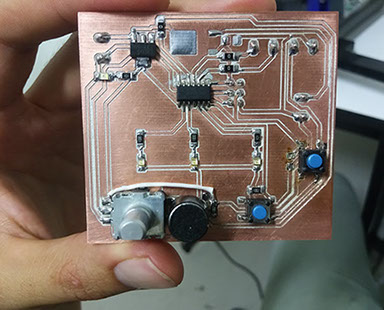 I made the first board considering it would have a motor for next week's assignment "outputs" and a lot of inputs, it had a potentiometer, a microphone, two buttons and an ultrasonic sensor, it was powered by a 12v DC source for the motor, and then with a voltage regulator lowered to 5V for everything else.