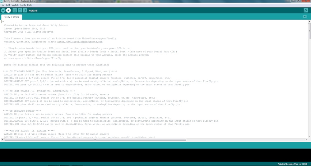 I am going to try yo use a program called firefly that connectes the arduino environment to Grasshopper, allowing for live control of a microcontroller through Grasshopper and vice versa. Thought this sounded very interesting, so I downloaded and installed it, following the instructions layed out here